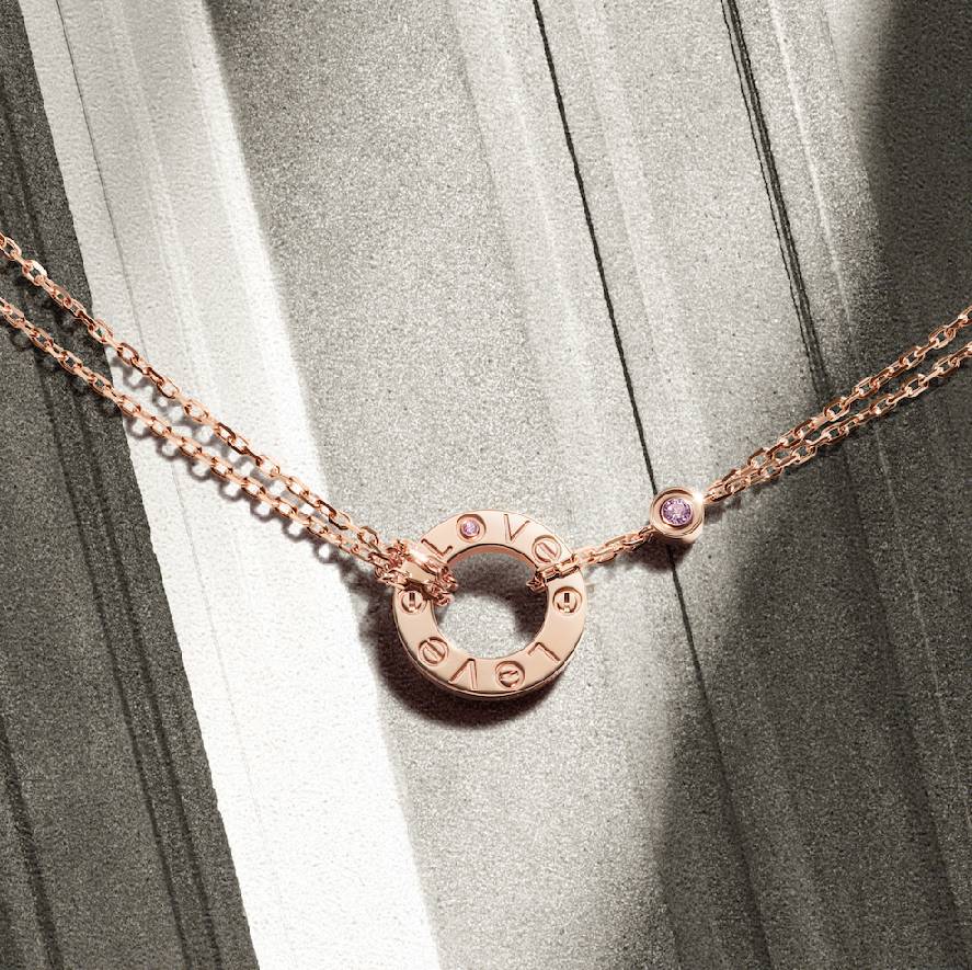 时值520之际,卡地亚特别呈献LOVE系列520特别款项链与手链,为爱赋予全新表达。新作延续了该系列标志性的圆环设计,温润的玫瑰金材质饰以粉色蓝宝石,为整体设计注入了明亮的色彩。
