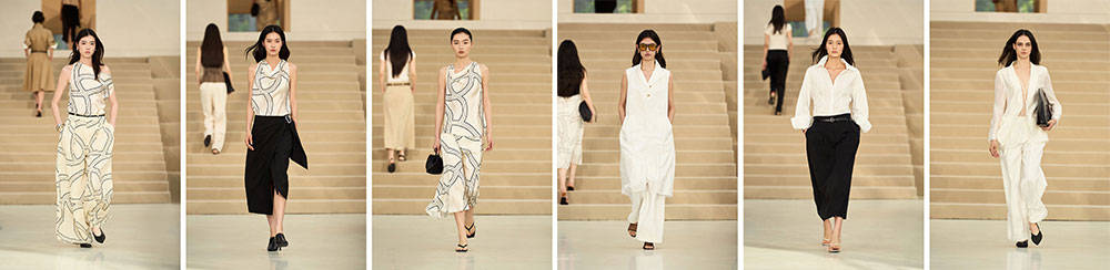 在这一季26春夏系列中,设计语言随品牌同步升级。简练之间,尽显细节的张力,无论是局部的堆叠、抽褶或是线条的转折,都如同书页间逻辑严密的行文,在轻薄的材质上留下了值得推敲的伏笔。服装色彩回归至永恒的视觉基调,以本真白、经典咖、午夜蓝等主色系贯穿,在柔韧且具有流动性的材质之上,勾勒出从容的身姿。偶尔浮现的艺术印花,在黑白分明的底色之间,注入随性而至的灵动感。