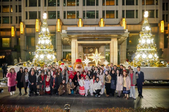 伴随着狮子Lion和圣诞老人的脚步,受邀嘉宾移步至正门圣诞树区域,共同迎来当晚最期待的亮灯时刻。北京丽思卡尔顿酒店总经理 Alfonso 先生,华贸集团酒店管理中心总经理及酒店业主代表魏丽芳女士,青苗国际双语学校领导代表 David Kainey先生 共同点亮象征着祝福与光明的圣诞树。璀璨灯光瞬间洒落,将冬夜点亮成充满温暖、希望与浪漫的冬日花园。