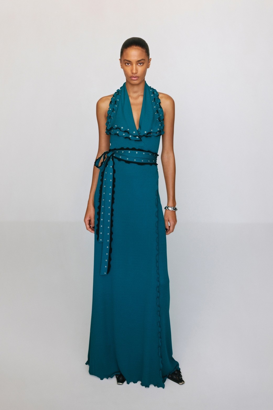 裹身连衣裙精选平织褶皱绉纱和天鹅绒面料打造,配以小网眼或镂空花卉图案。宽松的褶皱绉纱连衣 裙采用晕染印花,呈现模糊的水彩效果,点缀铆钉细节。