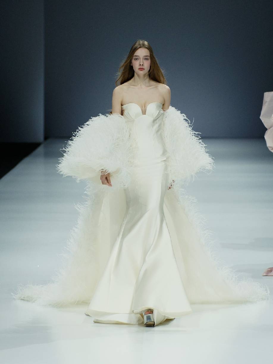 WANG FENG COUTURE 2024 秋冬系列礼服以丰富多样的花卉图案和刺绣,展现出绚丽旖旎 的色彩。同时,设计师还巧妙地运用了质感面料和层叠的褶皱,打造流动和层次感,使每一位穿着礼 服的新娘都仿佛置身于花园之中。以优雅廓形和精致细节打造璀璨夺目的华服,展现出女性的自信和 魅力,完美诠释刚柔并济的女性形象。