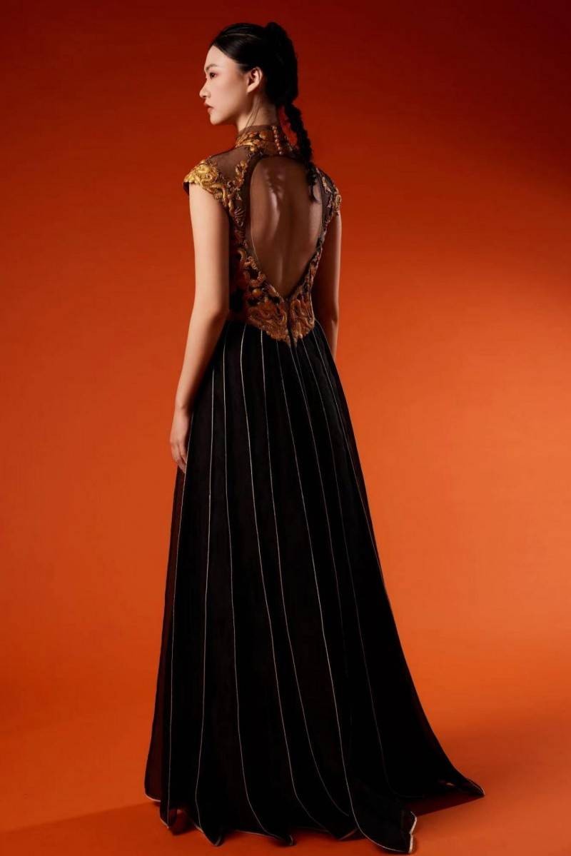 TIANXI天玺一向在高级定制工艺和质感设计方面不遗余力,本次系列中运用的苏丝、宋锦糅合高难度的双面苏绣工艺,提取栌贝、长春花、常磐、玉子、赤玉红五色,栌贝源于砗磲,灵力之色。溪谷之潺,其意青春盎然;扶摇于苍穹,潜意于深蓝玉子,离火九运,天玺游龙。将美好寓意悦纳于针线之间,在或温润或灵力的自然肌理上由心表达。独特的盘金绣技术渗透厚面料,塑造出立体浮雕感与装饰性交融的视觉效果。精心打磨的手工工艺、龙鳞配饰等流露出物与人心境印证的痕迹。在精妙技艺之中,亦能见之纯粹。