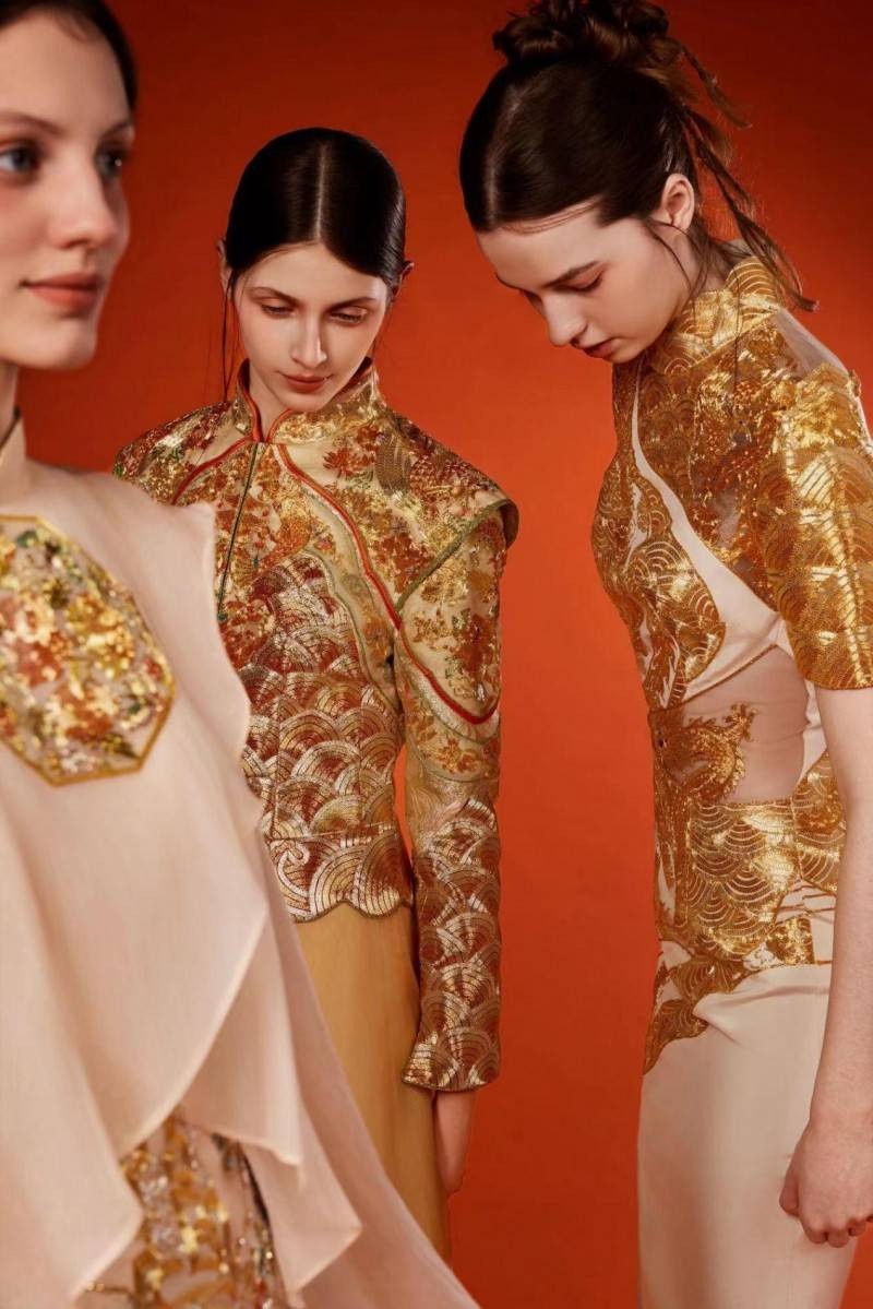 翩若惊鸿,晨露润鳞。主题「游龙」,TIANXI天玺延续品牌穿在身上的中国文化美学理念的同时,受宋锦、螺钿非遗文化启发,以融合非遗盘金绣、打籽绣、苏绣等工艺,搭配金至尊珠宝中式黄金套装,饰品在现代5D工艺和传统古法黄金工艺加持下,尽显典雅华贵,流光溢彩,将承袭东方韵味之美展现淋漓尽致。