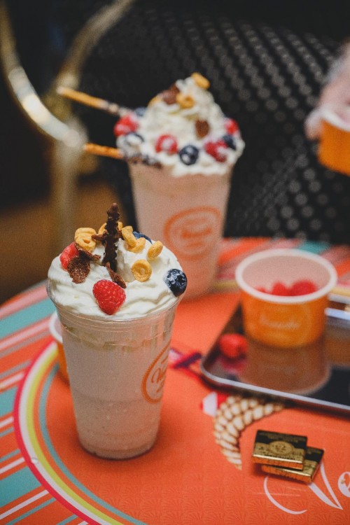 混合莓果奶酪蛋糕风味Gelato,作为Venchi在4月特别推出的限量口味,重新演绎了这款在世界范围内广受欢迎的甜点。以奶油马斯卡彭奶酪冰淇淋为基础,点缀混合莓果浆和柠檬饼干,呈现出口感与视觉的双重盛宴。而草莓奶油可可碎冰淇淋奶昔也不容错过,美味的榛子巧克力酱与奶昔的精妙融合,再搭配松脆鱼子酱状75%黑巧克力碎和品牌标志金币型巧克力!