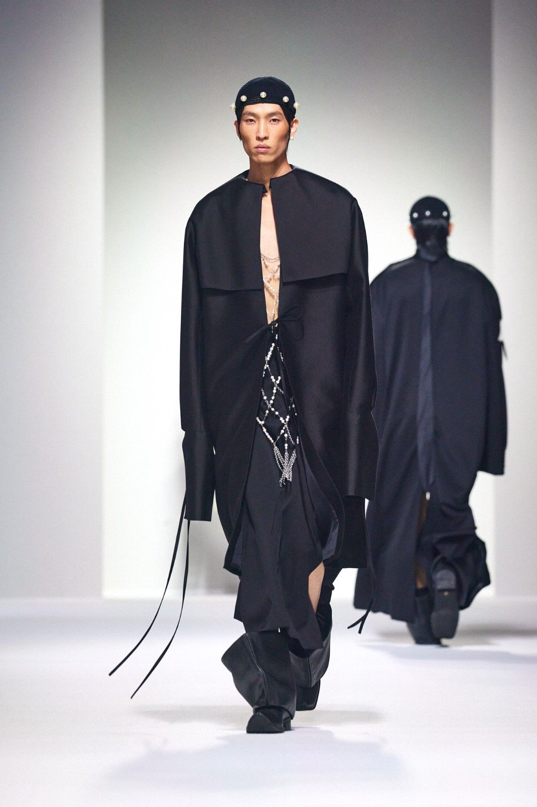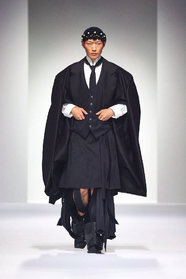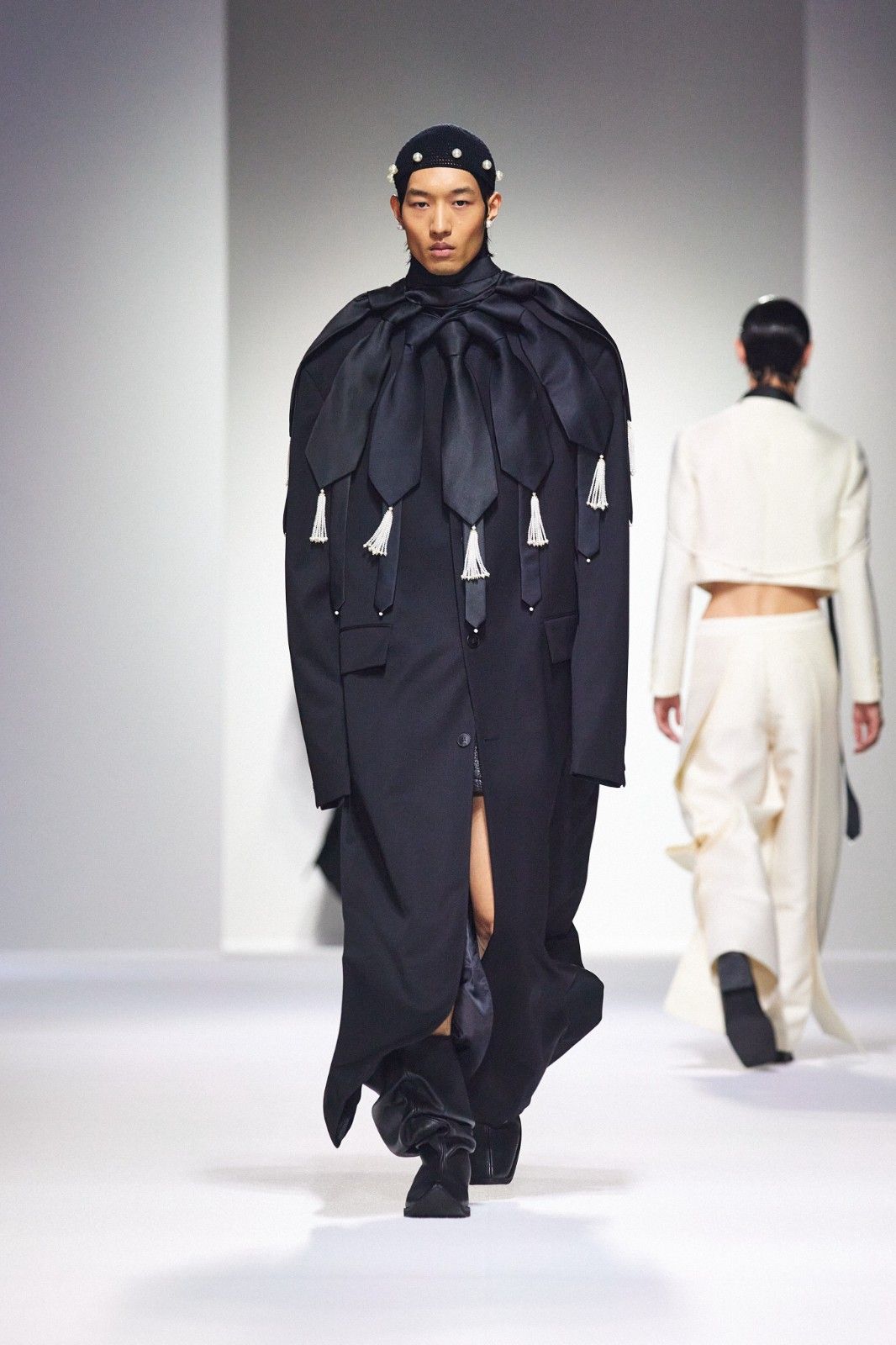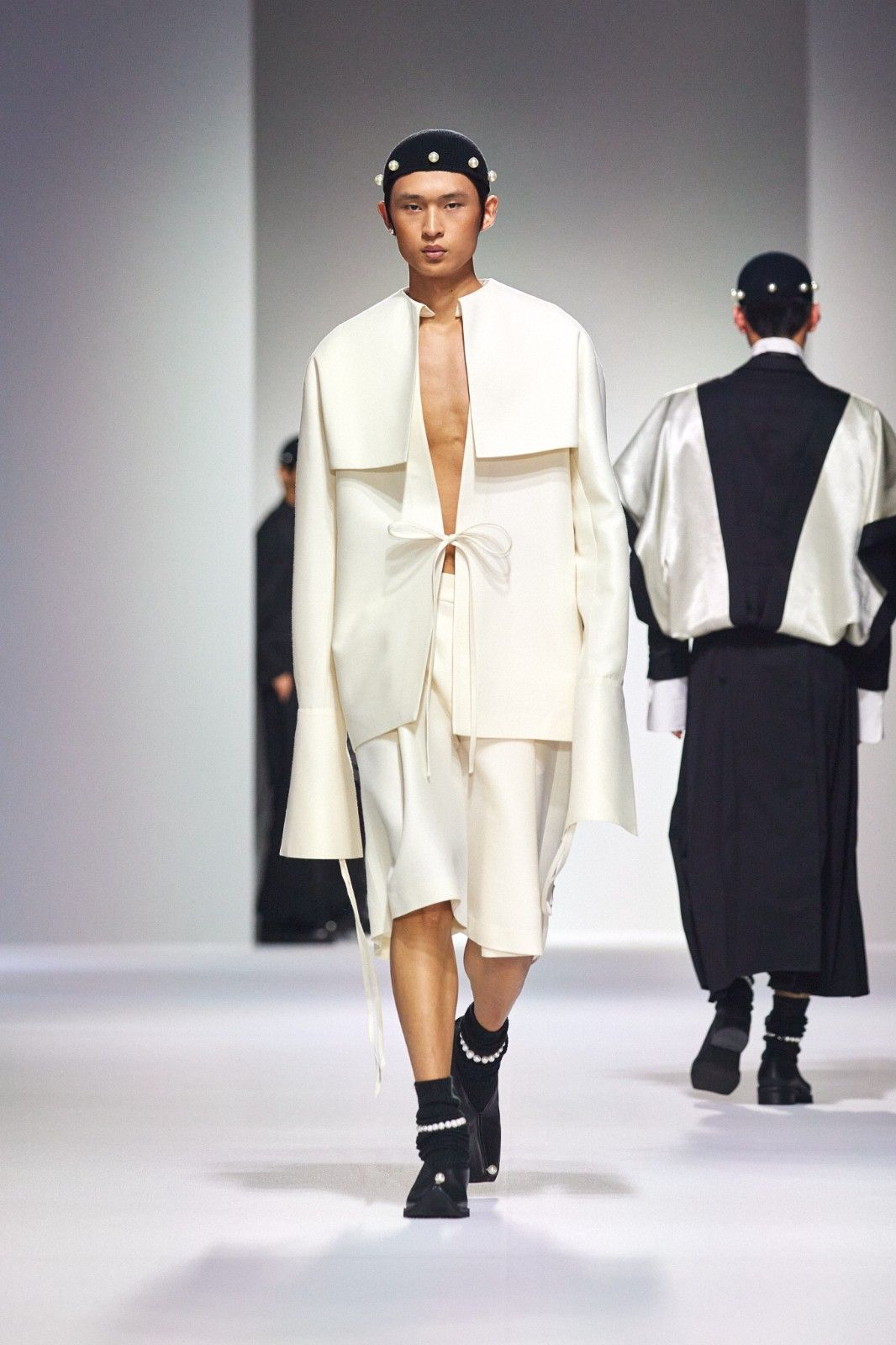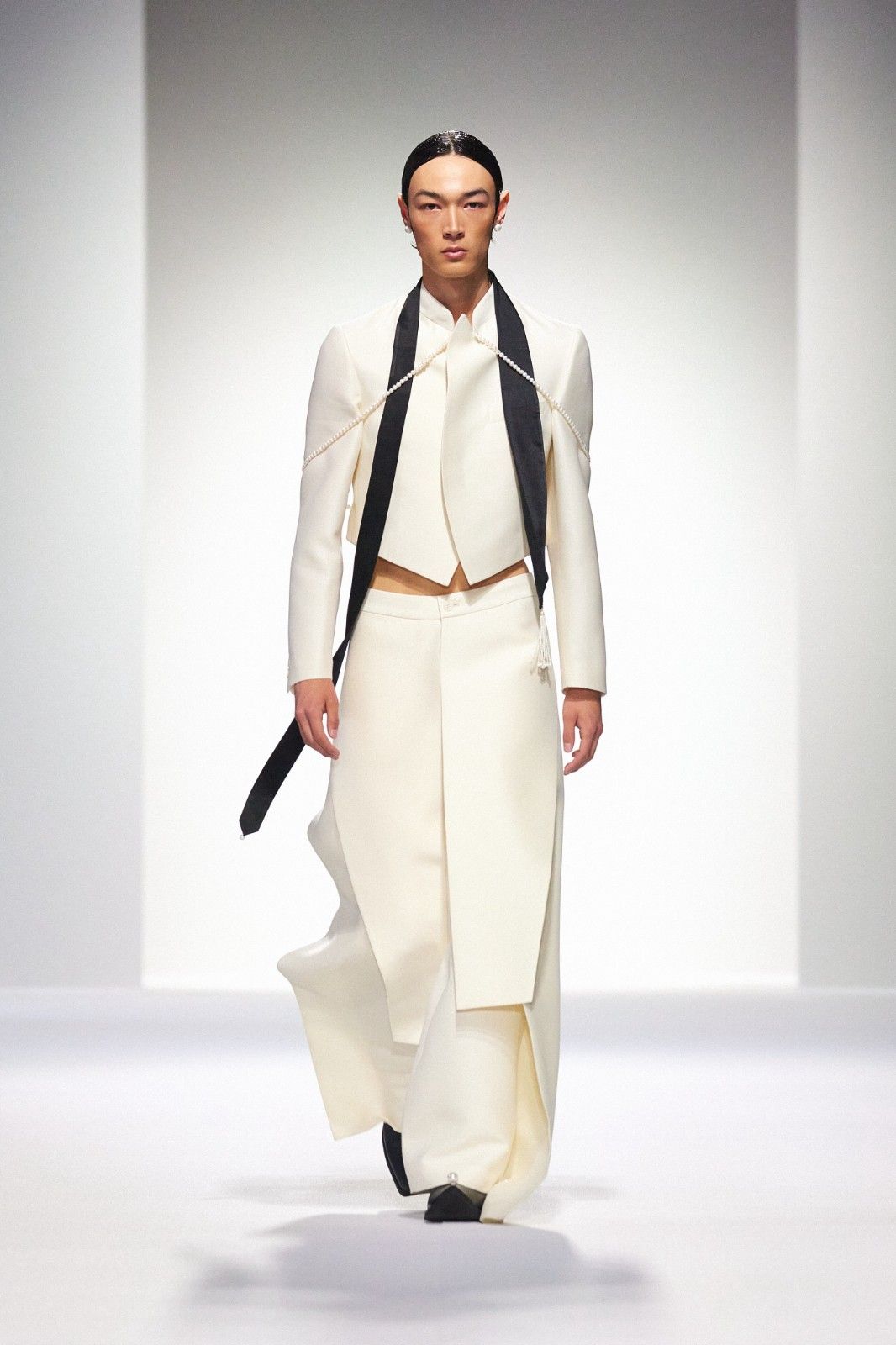 SEAN SUEN 2025春夏系列,以梅兰芳“双重身份”的交织为视角,引鉴其日常装束、外 交服饰与舞台戏剧扮相,化戏曲“立象尽意”的美学观点与“虚实相生”的哲学思想为设计灵感, 将京剧扮相中经典的云肩、水袖、玉带、绸球、流苏等元素,赋以写意化提炼与艺术化加 工,融入中式传统马褂、长衫、中山装与西式男装、礼服等梅先生喜爱的常服之中,致敬其散发着人性与艺术双重光辉的、精彩绝伦的一生… 东方之美,巨匠之作,亦在传承。梅兰芳先生从传统戏剧深耕,再创编时装新戏,后到脱胎于传统文化经典的古装新戏。纵目其秉持一生的美学观,他对本我与舞台角色的全方位塑造中,贯穿着他对时代需求变化的体察入微,极致追求着饱蕴东方内神的外在形式之美,这是一种包罗万象的、立体式的美。