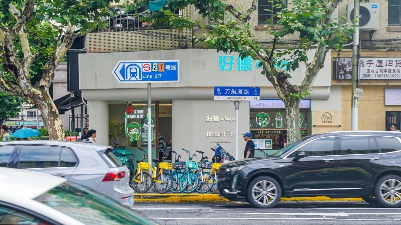 位于北京西路万航渡路口的好德Alldays X 光明玖壹玖Bright 919京园店具有独特的空间设计,店面设计时尚新潮,优美的弧形墙面、柔和的灯光、临街而设的木质长椅等元素,营造出一种亲切而时髦的氛围。24小时全天候营业,满足不同时间段的消费需求,这使它不仅是一个购物场所,更是一个社交和体验的空间。