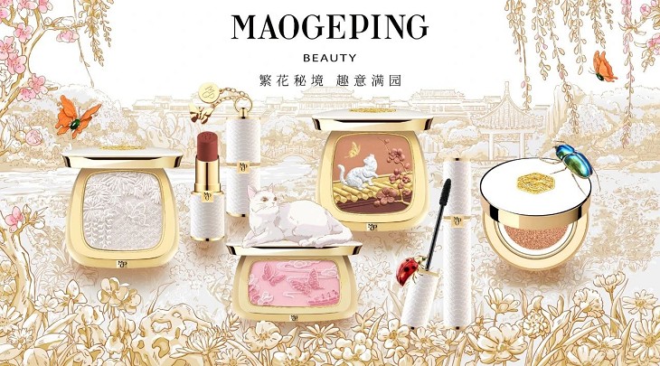 这一点,在品牌联名合作的选择上,也可以看到毛戈平美妆的坚持。它作为唯一与故宫文创签署长期深度合作的美妆品牌,自2019年起,每年推出“气蕴东方”限定系列,到今年七月已经推出了五季。第五季的灵感来源于故宫藏品“雍正款粉彩桃蝶图天球瓶”与《清宫兽谱》中洁白灵巧的御猫。