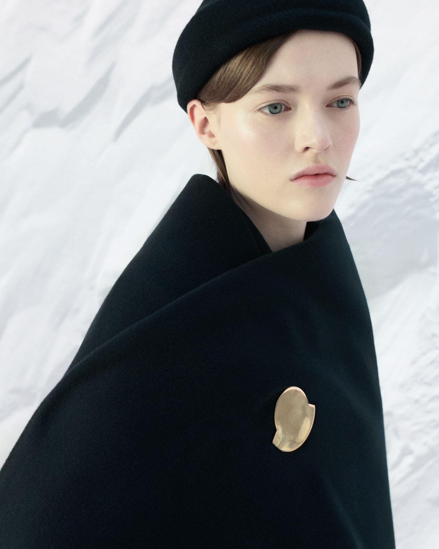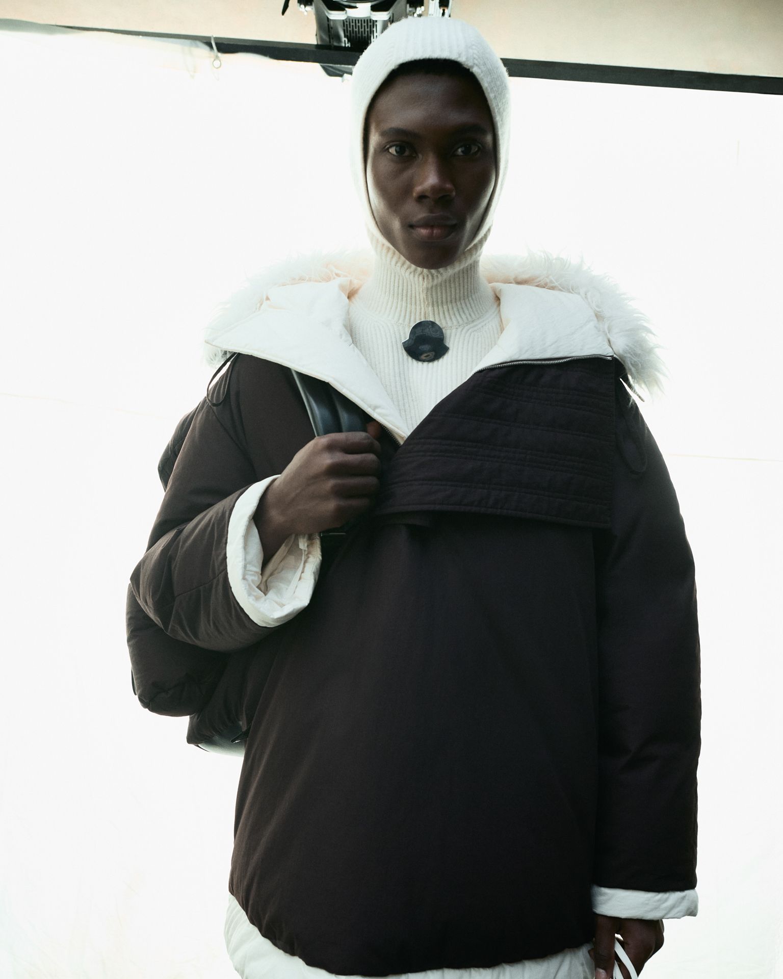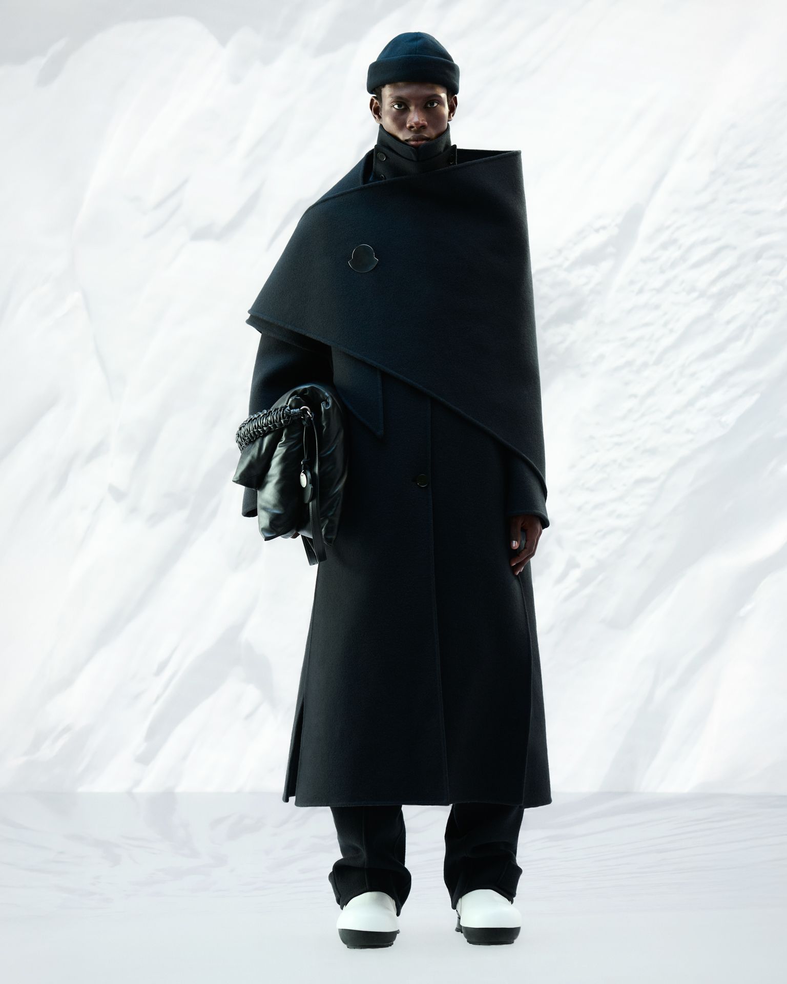 本系列的先锋设计藉由数字影棚短片与影像呈现,模特置身于壮丽自然景观的投影中,虚实交织,如梦似幻。巍峨松林与皑皑雪峰构成静谧背景,致敬盟可睐Moncler高山渊源。服饰作品凝结自然之静美,面料随形而动,风韵天成。