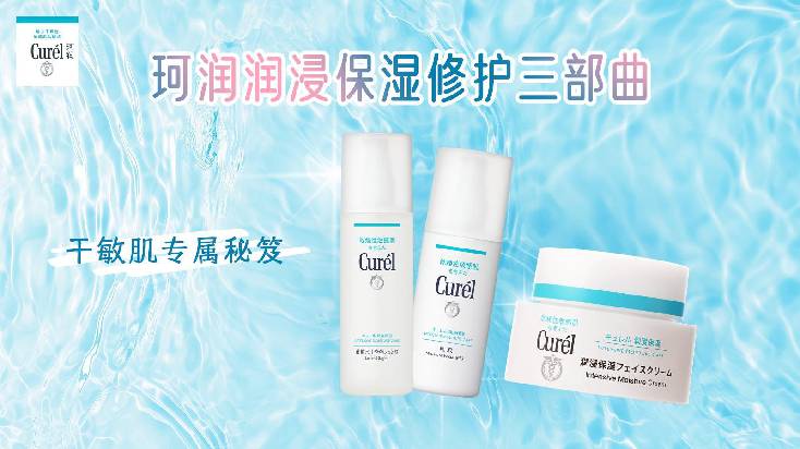 Curél珂润王牌保湿修护三部曲——润浸保湿化妆水、保湿乳液、滋养乳霜,为干敏肌筑起一道坚实的安心防线,用科学配方为敏感肌肤带来稳稳的安心感。
