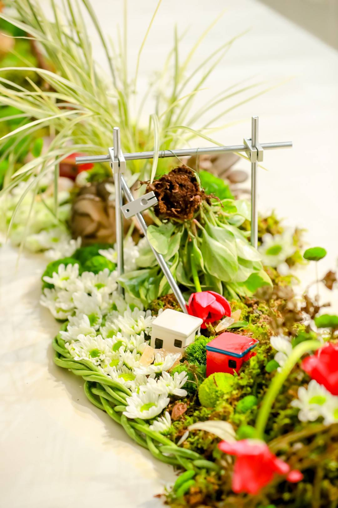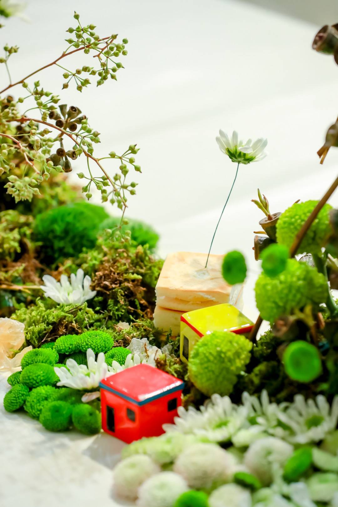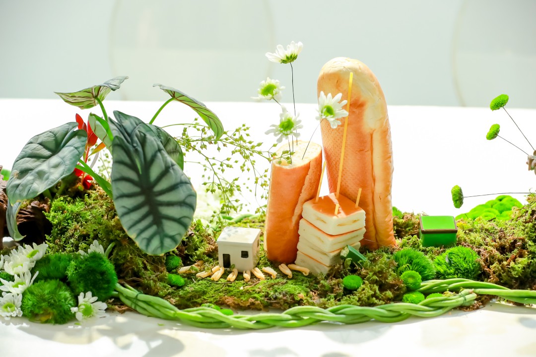 晚宴现场的桌面装置融合了对于“构筑滋养力量”的思考:以植物根系与食物为材料,在桌面上构筑一座流动的、生长的微缩城市,意在回应展览对边界与时间性的探索。这一装置并非一座凝固的纪念碑,而是一处由根系网络、发酵的面团、干涸的果壳与缠绕的藤蔓共同构成的“延迟景观”。