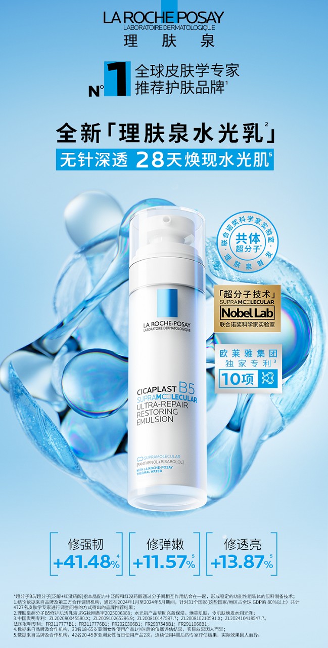 作为本次官宣同步推出的核心力作,理肤泉水光乳以创新科技引领科学护肤迈入全新阶段。产品搭载品牌联合诺奖科学家实验室研发的独家专利2,创新应用科学家曾三次获得诺贝尔化学奖认可的超分子技术。该技术通过超分子化学反应,生成新的分子间“榫卯”结构——共体超分子【B5+红没药醇】成分,突破单一成分功效天花板。产品复配胶原酵母菌3等皮肤学级成分协同增效,进一步拓展了科学修护的更多可能性。