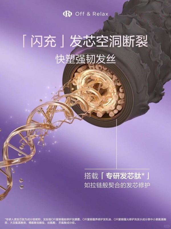 第一轴“发芯再生轴”层面,核心技术在于解决二硫键断裂问题。Off&Relax运用其专研发芯肽,这是一种与亚洲人发芯角蛋白氨基酸序列高度同源的仿生多肽,能够像“原生补丁”一样精准嵌入受损的发芯基底,精准修复因漂、染、烫而断裂的二硫键、填补发芯空洞损伤处。