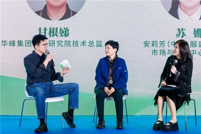 【从左到右:纺织品化学工程师—姚蔚铭、华峰集团材料院—技术总监甘根娣、安莉芳市场与品牌中心副总监苏娜】