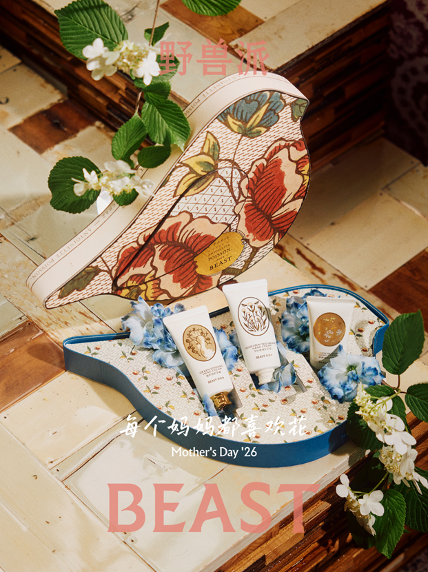 花礼品类同样别出心裁,今年首度推出“苹果脸玫瑰”瓶花套组礼盒——限定印花纹样取自巴黎传统多米诺纸,苹果脸玫瑰与小雀鸟交织其间,搭配12支精选鲜花同盒呈现,置于家中,四季皆好看。同期推出“笑颜如花”小鸟花盒与“心花常开”繁花花束,精选苹果脸玫瑰以及多种时令鲜花,将温柔与感恩化作一份心意,献给妈妈。