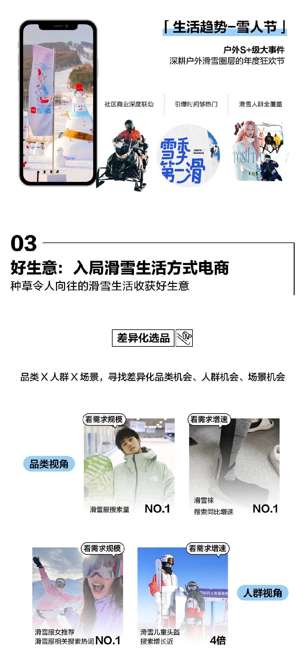 冰雪为伴,蓄势而来。热雪升温带动冰雪市场增长,根据国家体育总局冬季运动管理中心发布的《大众冰雪消费市场研究报告(2023-2024冰雪季)》可知,如今我国冰雪运动消费市场规模庞大,各类冰雪运动消费占比高,市场规模已超1500亿元。 小红书作为时尚潮流趋势灵感诞生地、品牌的「天然种草场」,也凭其独特的社区氛围与用户基础,成为当代滑雪爱好者们交流滑雪心得、选购滑雪装备的重要阵地。大量滑雪爱好者们在社区中的自发分享、交流互动,激发出有关滑雪穿搭、滑雪场地、滑雪装备、滑雪潮流等新趋势及灵感。小红书不仅持续引领着冰雪文化及产业的蓬勃发展,也为各大滑雪行业相关品牌的高质量生长带来新可能。 本期【CASE 精选】带来【品类特辑-滑雪装备】营销指南,通过「全景观察,人群观察,营销观察」三大版块引领户外滑雪品牌探索营销新解法,助力更多品牌在小红书打开冰雪营销的无限可能。 「全景观察」 滑雪市场乘风起 用户需求高涨,品牌入局竞速 滑雪周期更长|从“百日经济”到“半年规划”:用户的滑雪需求呈现出更前置、更爆发、更持续的趋势。根据小红书相关数据显示,蓄水期雪场相关搜索同比增长190%+、成长期滑雪装备相关搜索同比增长100%+、爆发期滑雪相关搜索环比增长350%+、长尾期滑雪入门相关搜索同比增长320%+。 滑雪频次更高|装备需求更深更广:用户滑雪装备需求全面爆发。用户对于滑雪装备的认知持续增强,“滑雪不再是简单买一件滑雪服就去雪场的运动”,除滑雪服外、越来越多的用户开始购置“从头到脚、从里到外”的专业装备。 120+品牌入局|小红书滑雪赛道竞争激燃:随着越来越多户外滑雪品牌入局小红书。根据小红书官方数据显示,社区中百万级笔记阅读规模品牌数量增长10+倍。值得关注的是,中小品牌的崛起让头部品牌效应减弱,赛道竞争愈发激烈,用户争夺进入白热化阶段。 「人群观察」 入门-进阶-硬核 各类滑雪玩家都在小红书 随着滑雪运动热度席卷、成为雪季顶流,从小白滑雪者到进阶滑雪师、再到硬核滑雪家,各类滑雪人群需求更加细化、生活方式特征及标签更加精细。根据小红书相关数据显示,小红书滑雪兴趣人群规模已提升近40倍,专业滑雪者、亲子滑、滑雪男生/女生等相关搜索均迎来显著增长: 小白滑雪者|热爱运动的娱乐大生活家:滑雪新手以年轻新一线高消费女性群体为主,在生活中更注重娱乐属性的TA们,将滑雪当作通往向往美好生活的钥匙,并在娱乐入门的过程中探索有关滑雪的更多趣味。 进阶滑雪师|热爱城市与出行的时尚滑雪师:对于出行穿搭属性强、热爱记录生活的年轻一线高消费群体而言,滑雪既要滑的好也要滑的美,不仅要carry雪场,也要美翻全场。 硬核滑雪家|消费力极强的户外运动热爱家:这群以一线高消费的26+用户群体为主的滑雪发烧友,不仅关注世界、热爱各类户外运动,也在滑雪的速度与激情中释放热爱、领略世界、挑战自我。 「营销观察」 品牌驰骋制胜雪地 营销赛道三部曲 精种草|搜索场滑雪全周期布局:滑雪装备品牌可根据滑雪运动需求周期,抢占直接搜索高意向决策人群,渗透历史搜索人群,并通过捕捉赛事、家生活、秀展等机会场景,激发新需求、寻找市场新增量。 登高点|抢占滑雪用户第一心智:品牌可联动小红书营销IP,通过「专业X时尚X生活」的三大趋势合维,实现品牌脉冲式热度爆发,打造户外滑雪品牌全年热度至高点。 好生意|入局滑雪生活方式电商:户外滑雪品牌应围绕「品类X人群X场景」进行差异化选品,寻找差异化的品类机会、人群机会及场景机会。并基于平台中多场域触达,种草一种好生活,激发用户对滑雪品牌的向往感,从而实现好生意的生长结果。 下滑长图 查收小红书2024滑雪装备营销指南 驰骋新雪季 激发生长新活力