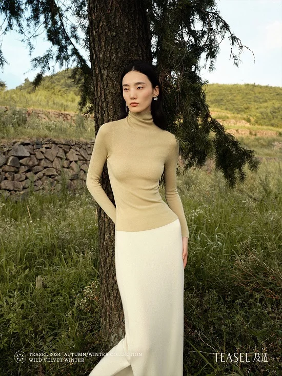 模特身穿TEASEL 2024AW可机洗可烘干高领羊毛打底衫