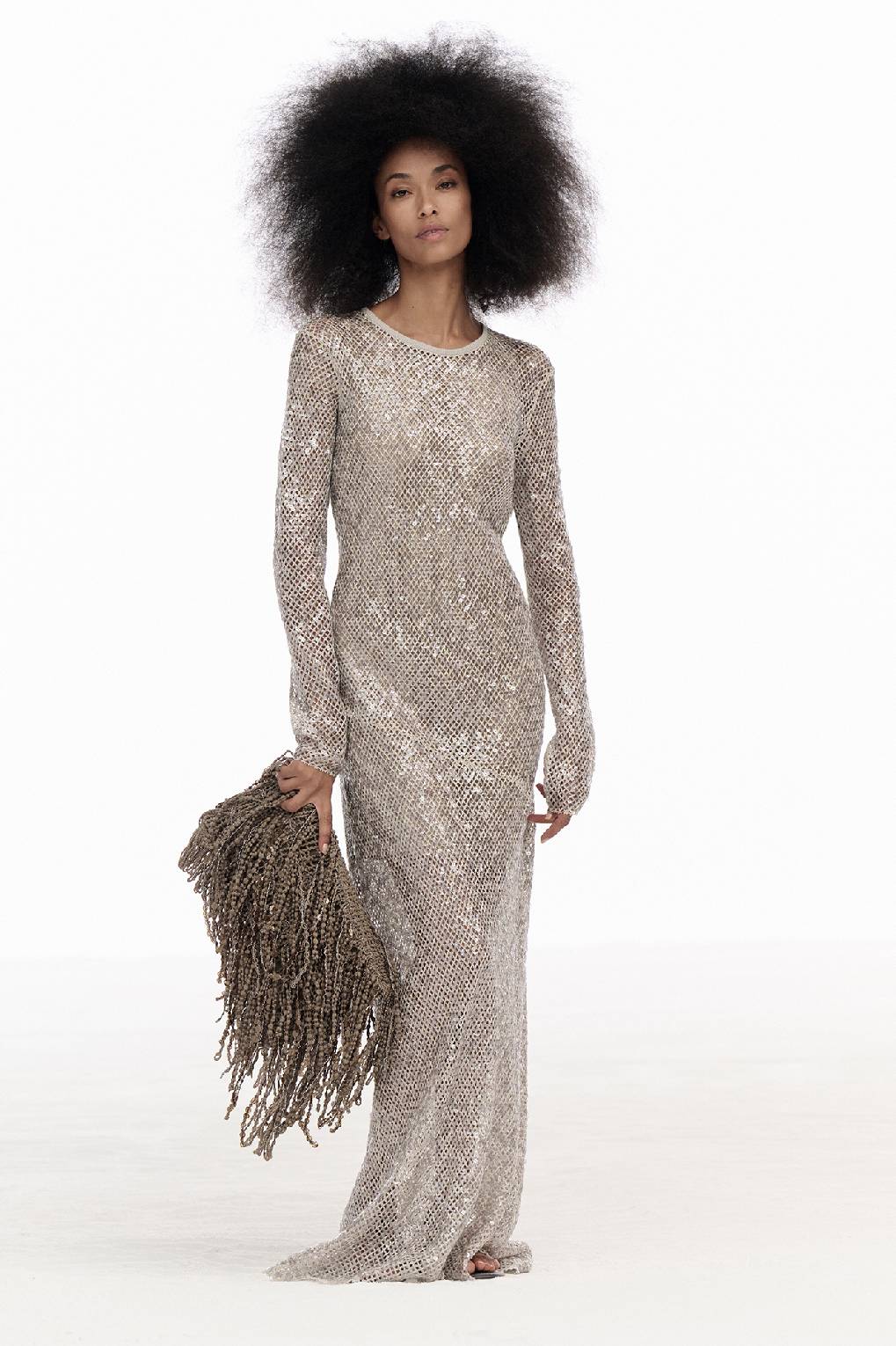 轻盈的织物上交叉着裂纹效果的刺绣,珍贵的结绳编织赋予立体感。无论是简单针法或图纹钩织,珍贵而自然的纱线在设计巧思下焕发新生,显化为粗织流苏或光滑的金属纹理。