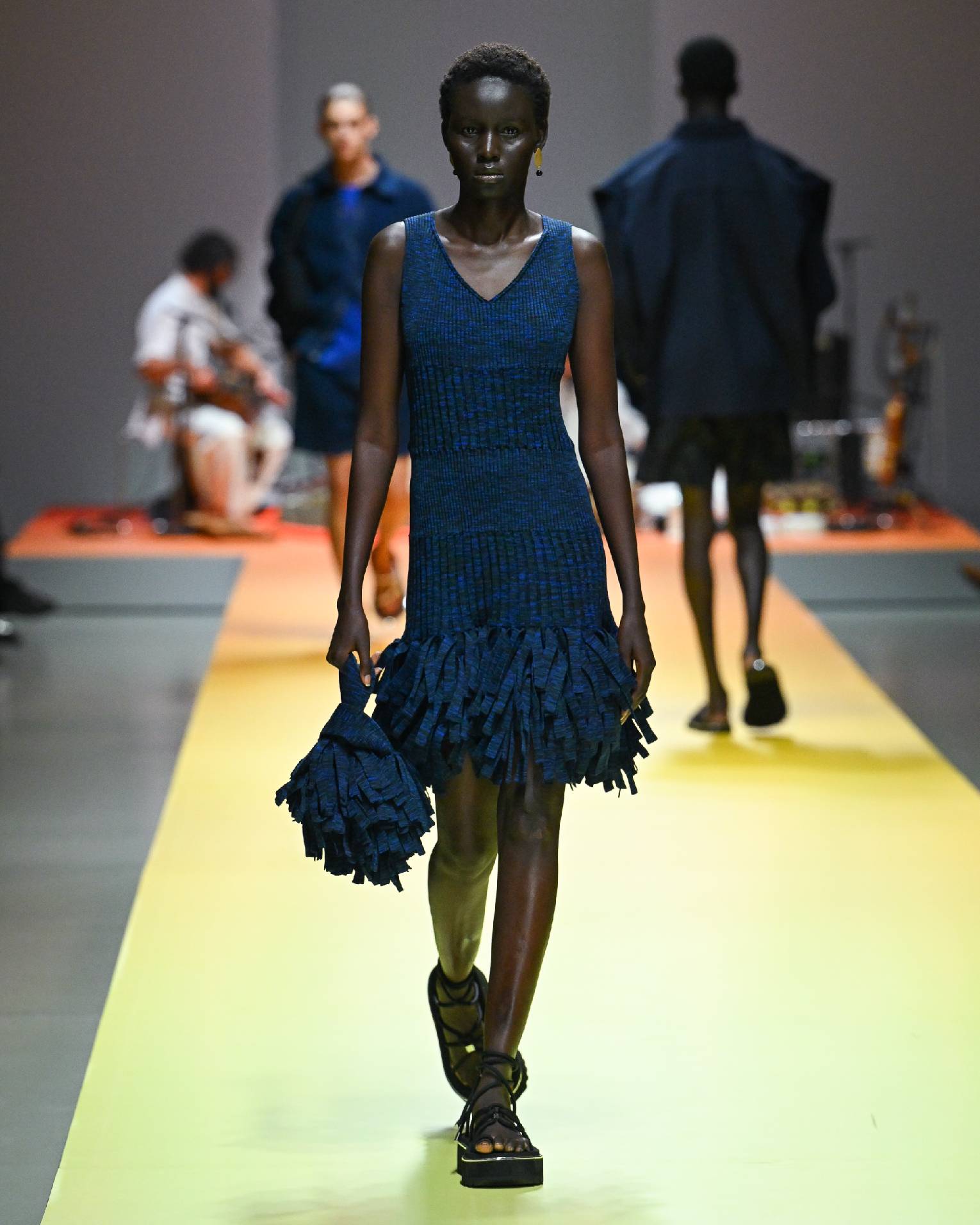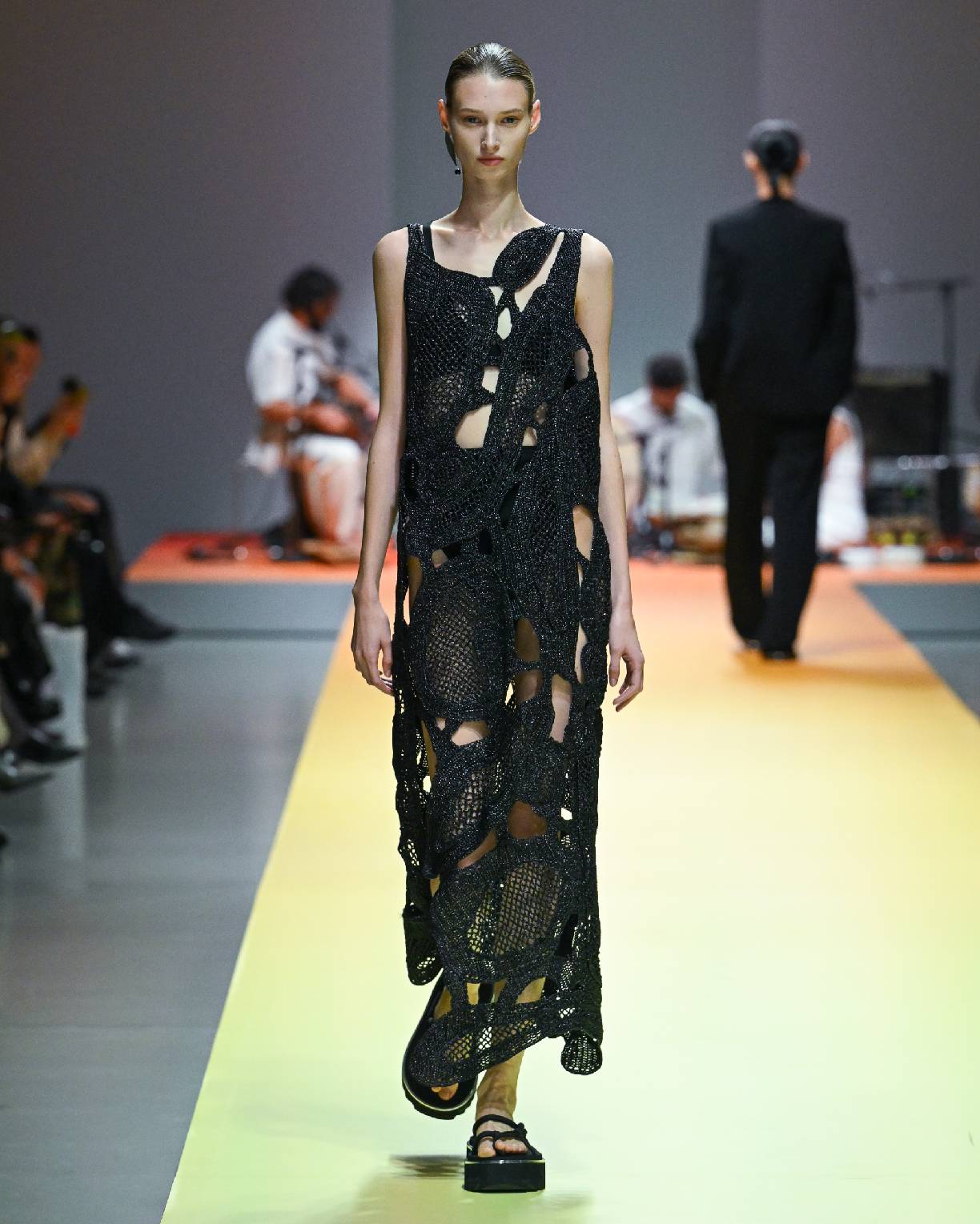 这款采用再生聚酯纱线经电脑编程设计制成的连衣裙,布满细 小的孔洞,将相同材质的针织条带用原手工的方式穿过这些孔 洞,最终在裙身上叠加了 2320 条流苏。这款连衣裙采用单一材 料制成,不仅外观华美还易于打理。