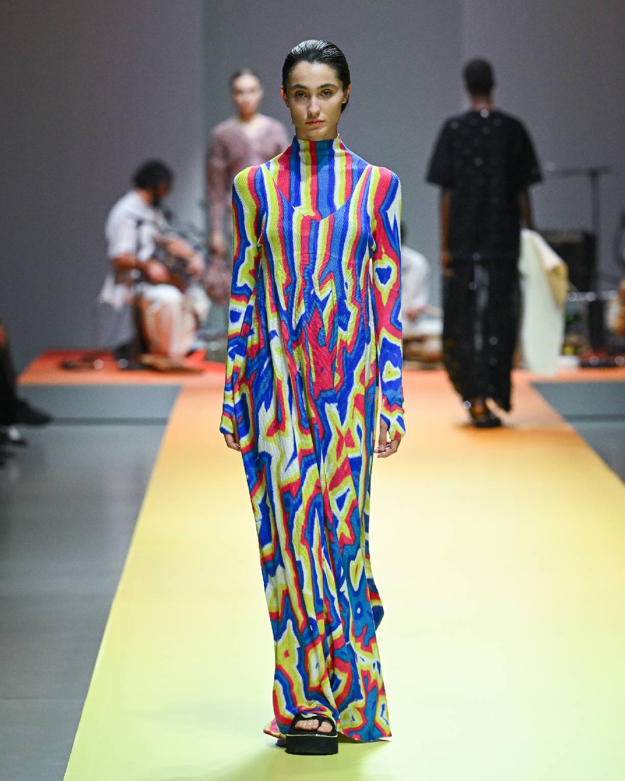 由日本原产丝绸制成的连衣裙和两件套装以大胆的迷幻图案染 色制成。灵感来自传统的日本染色技术“CHUSEN”(注染), 染料在工匠的控制下以条纹形式倾倒在随机折叠的产品或部件 上,偶然间片刻创造出万花筒般的图案。