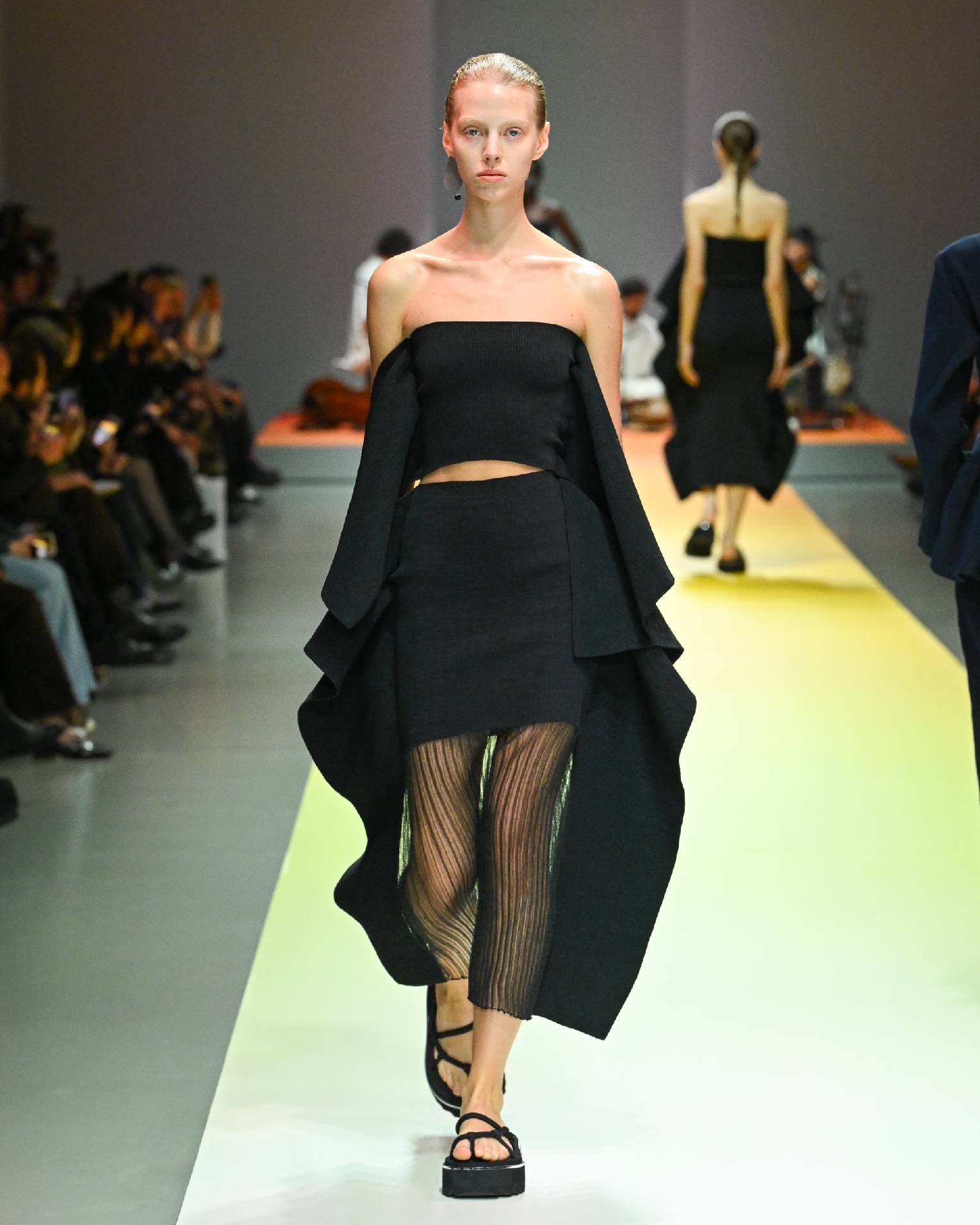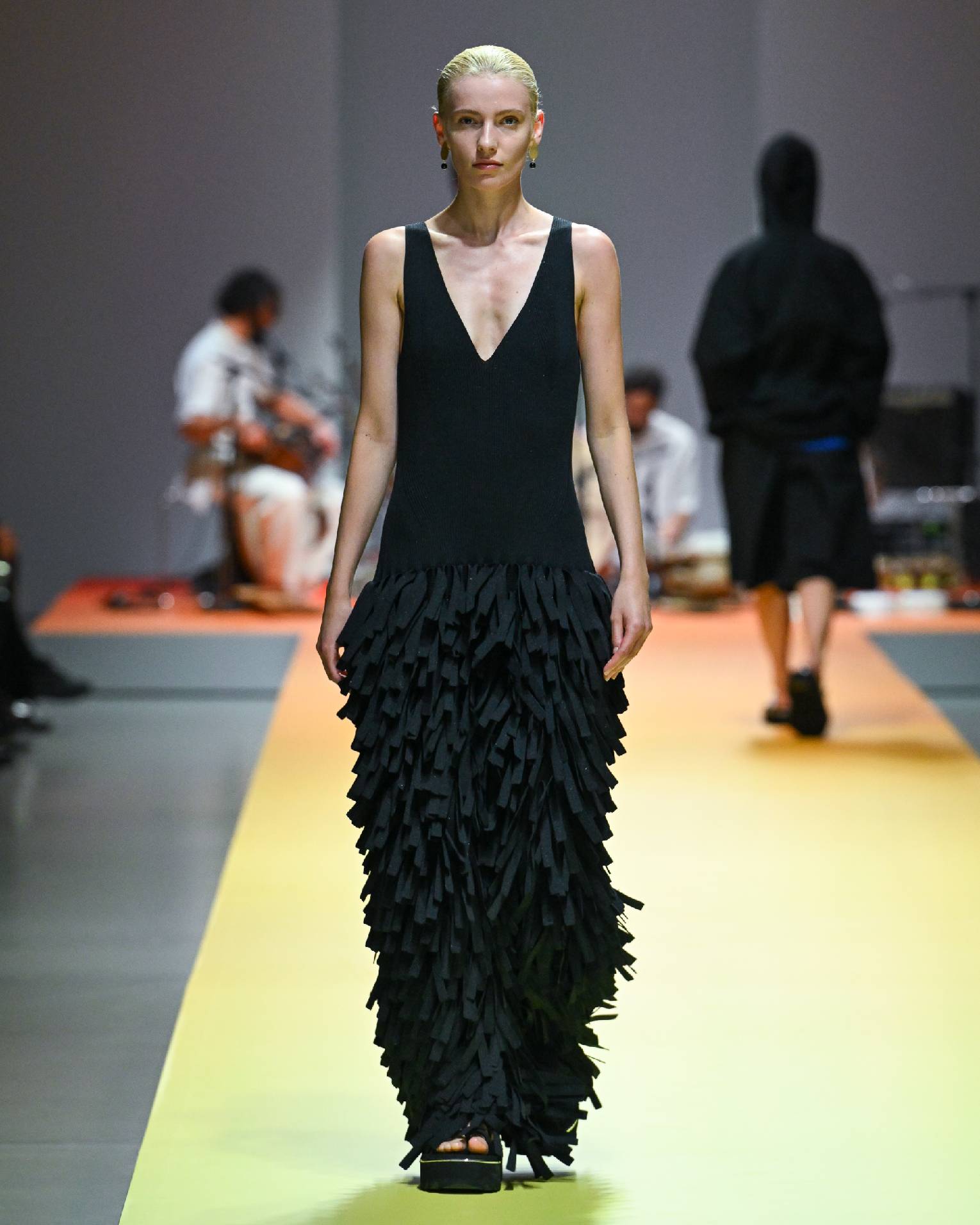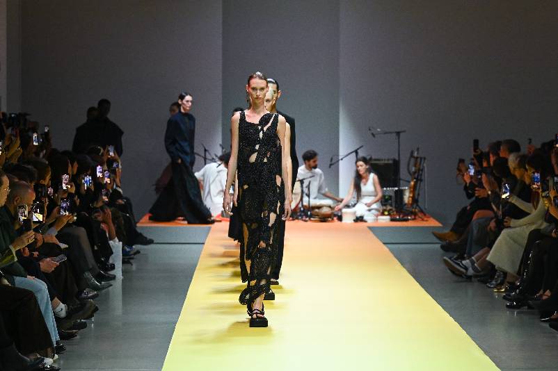 (法国,巴黎)9 ⽉ 23 ⽇,星期一,2025 春夏巴黎女装周的首日,CFCL 在东京宫(Palais de Tokyo)的 “Saut du Loup”空间呈现了自 2022 年加入官方日程以来的第二场时装秀。秀场以富有活力的渐变维他命橙色覆盖,萦 绕着斯洛文尼亚实验器乐组合 Širom 的民族与现代音乐。融合了二维与三维的传统技艺与尖端科技的丰富单品 ,在此展现了一种与未来世界无缝连接的美好愿景。