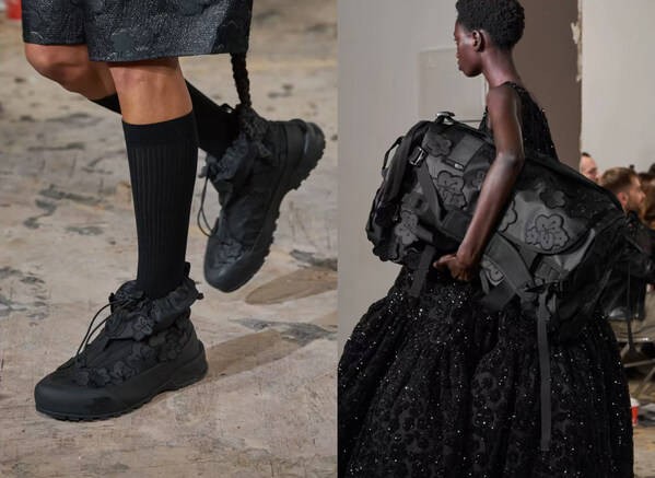 不同于北面早前偏向于潮流领域相对 Unisex 气质的联名,本次合作更偏向高级时装和女性化。北面惯有的利落感给予 Cecilie Bahnsen 更多创意切口,经典冲锋衣、克里夫鞋和驮包上被装点了花卉和刺绣等诗意细节,刚柔并济的造型亦将娇俏灵动的户外风可视化,也突破了原有应用场景——"超级户外功能性" 和 "超级女性化" 的极致反差感背后是一次新的风格浪潮,更是北面将专业户外深入时装的尝试。