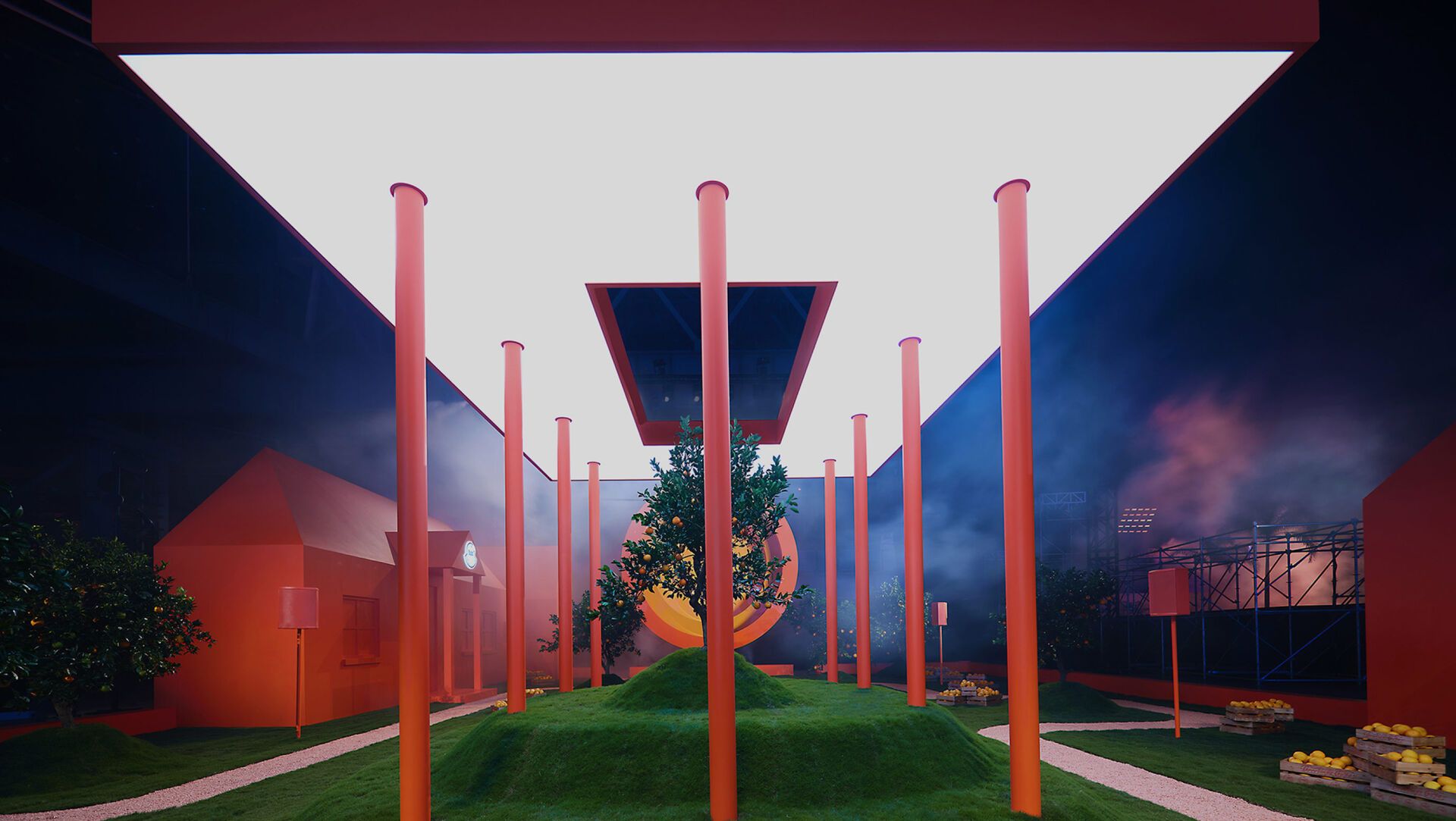 这座富有建筑感的农舍与色彩明亮的橘园沐浴在温暖迷人的光线下,灵感源自 Glover 在加州奥海镇的 Gilga农场。农舍外墙嵌有扬声器,播放着 Gilga电台广播,为场景营造声音氛围。模特于果园中心的高台上展示系列作品,为整个空间注入蓬勃活力。