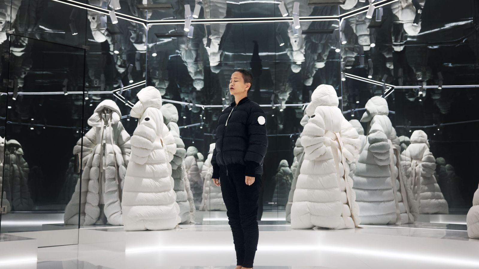 这一空间结构展现了时尚、功能及美学原则和谐共存的世界,其未来主义设计与保护意义与该系列遥相呼应。Moncler + Rick Owens 系列精妙融合品牌精髓,将经典放射状绗缝应用于超大羽绒服和飞行夹克、长袍,以及黑色、土灰色、白色等色调的时尚质感连帽披风。