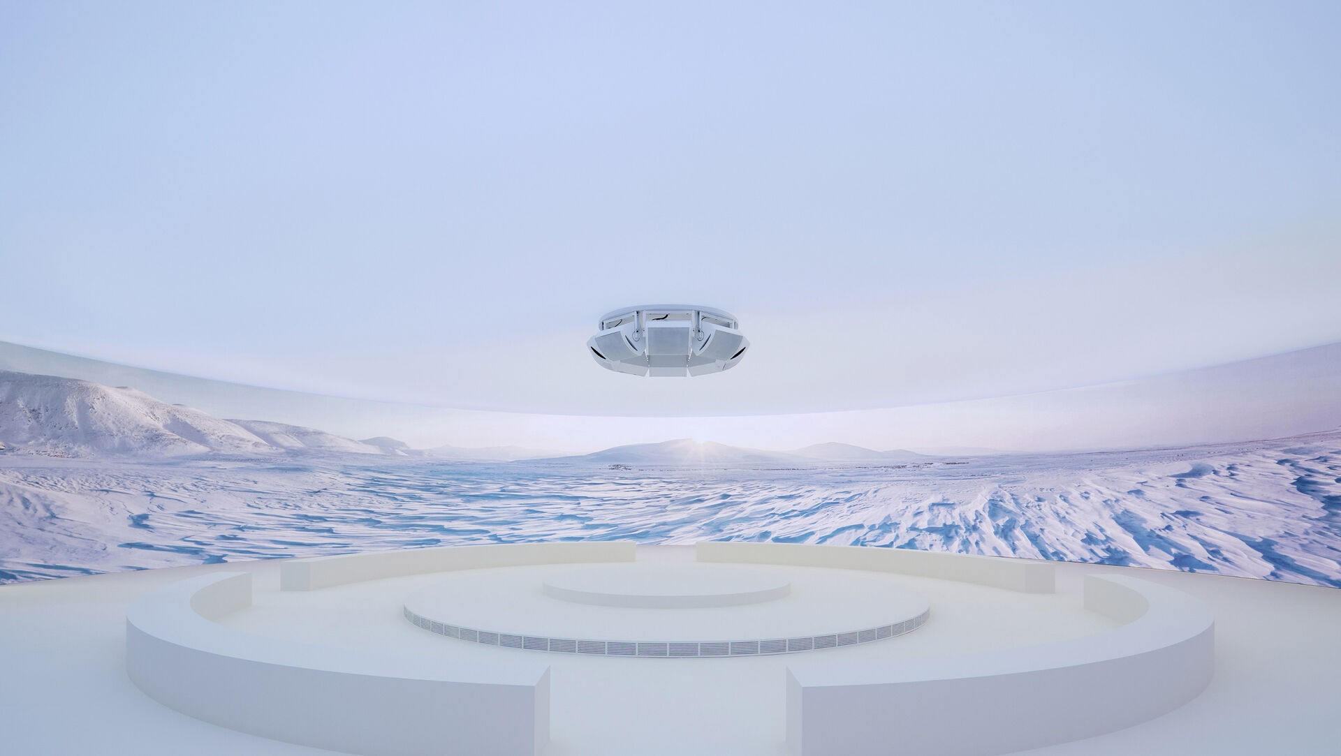 宾客将踏入极具未来感的山地场景之中:现实与 AI生成图像相结合,休息区与投影屏幕无缝衔接。银色布景中央的定制多功能展台从盟可睐 Moncler 的山地基因中汲取灵感,作为该空间的配乐播放器来提升整体体验的感官维度。