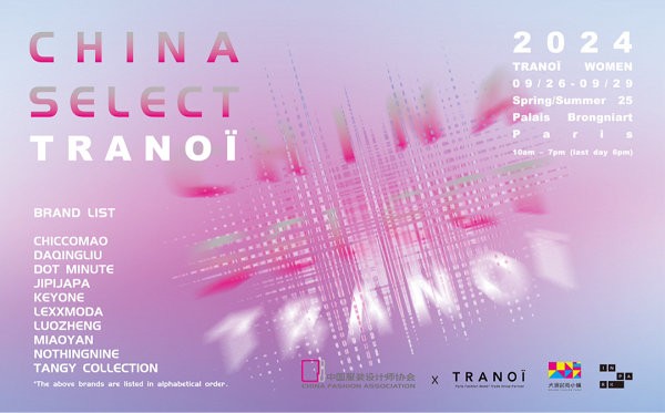 中国服装设计师协会与法国TRANOI再度联手,共同推选了10个中国设计师品牌于2024年9月26日至29日巴黎时装周期间精彩亮相CHINA SELECT @ TRANOI 。这10个品牌分别从不同角度展示了当代中国时尚的多样性,从华丽服装到精美鞋帽,从传统非遗工艺到创新3D打印,从东方传统美学到前卫潮流时尚,以此为契机让世界了解到更多中国当代时尚的独特风采。这10个品牌是:CHICCO MAO、DAQINGLIU、DOT MINUTE、JIPI JAPA、KEYONE、LEXX MODA、LUO ZHENG、MIAOYAN、NOTHING NINE、TANGY COLLECTION(依首字母排序)。