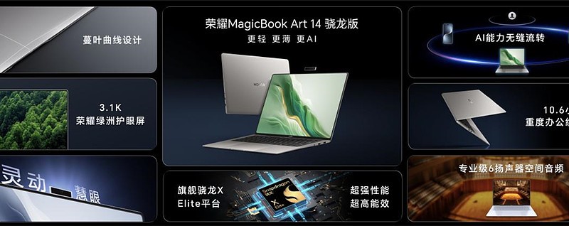 10月30日,在荣耀Magic7系列旗舰新品发布会上,早前于2024德国柏林消费电子展率先亮相的荣耀MagicBook Art 14骁龙版在国内正式发布。作为荣耀首款基于骁龙X Elite平台打造的全新AI PC,它不仅承袭了荣耀MagicBook Art 14的超轻薄时尚商务设计理念、顶尖的护眼技术以及极致的影音体验等优势,更在此基础上实现了性能、续航以及AI能力的全面革新。荣耀坚持以创新使能AI PC,不仅能基于信任环无缝调用跨设备、跨系统的AI能力,还以全新升级的智慧搜索以及全新推出的AI PPT创作等功能,再次引领AI PC时代。