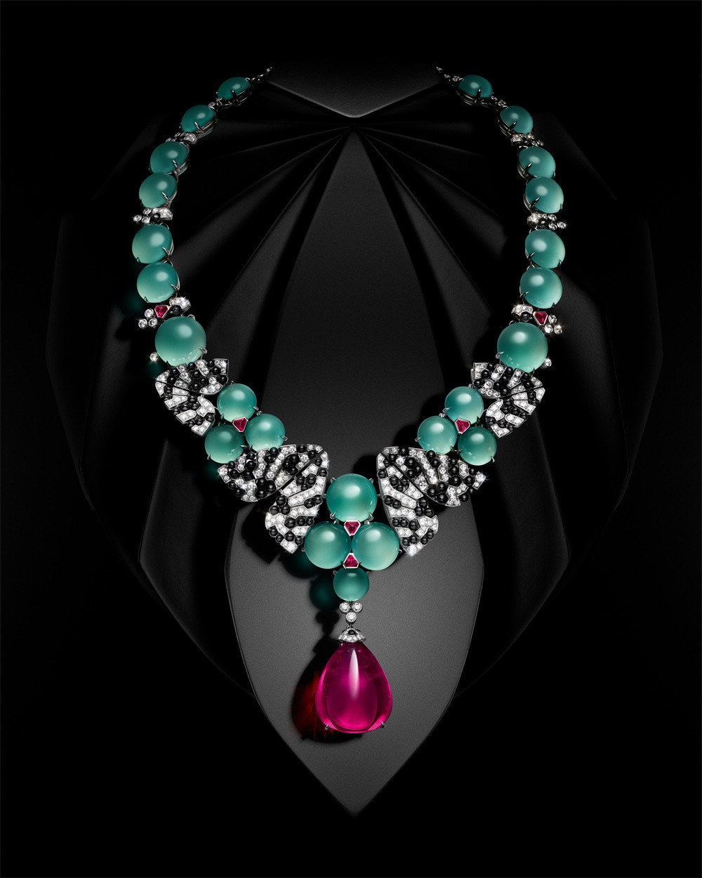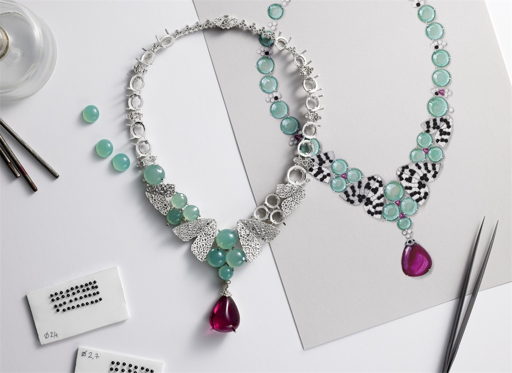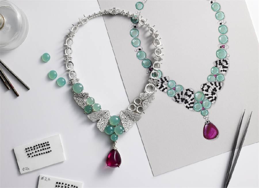 它们仿似于颈间轻舞,优雅翩跹。翅膀的黑白配色与清润的绿玉髓圆珠形成鲜明对比。同时,一颗63.76克拉红碧玺吊坠耀眼夺目,整体营造出色彩丰富、和谐迷人的美感。