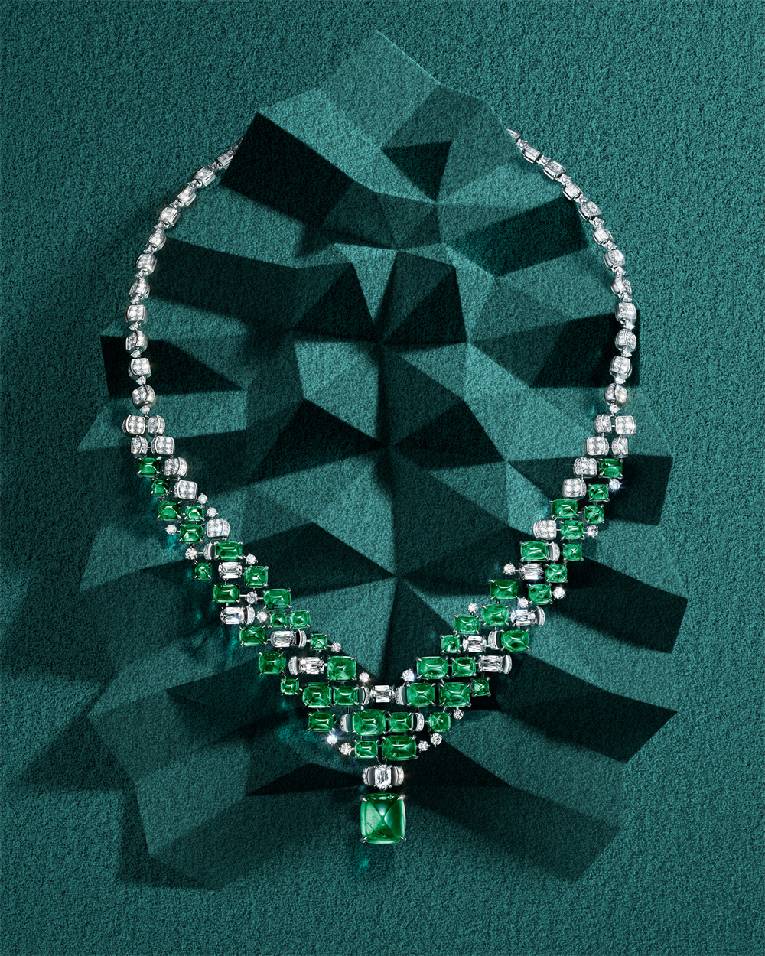 象耳、象鼻以及祖母绿打造的眼睛巧妙隐匿于项链中央,与三角形、菱形和风筝形切割钻石排布而成的几何图案融为一体。