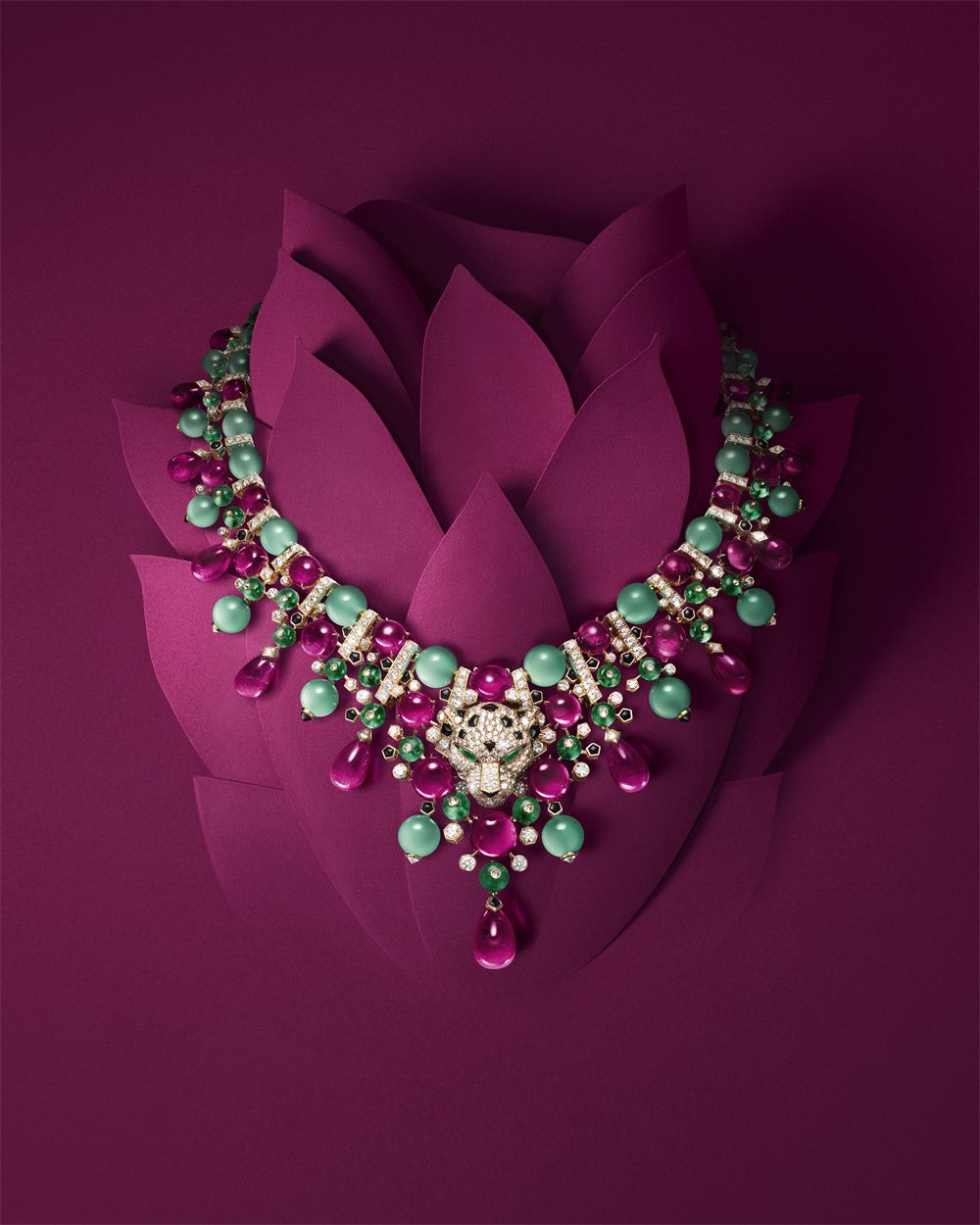 项链设计细节精妙,祖母绿豹眼敏锐犀利,在黑漆的点缀下更显庄严。红碧玺、绿玉髓和祖母绿有序排列,构成丰富绚丽的色彩组合。