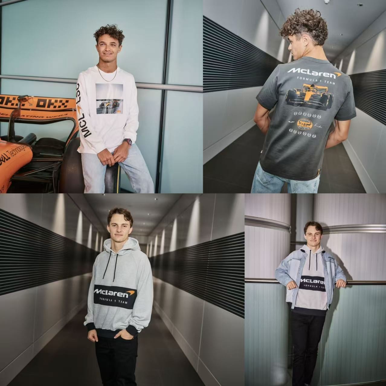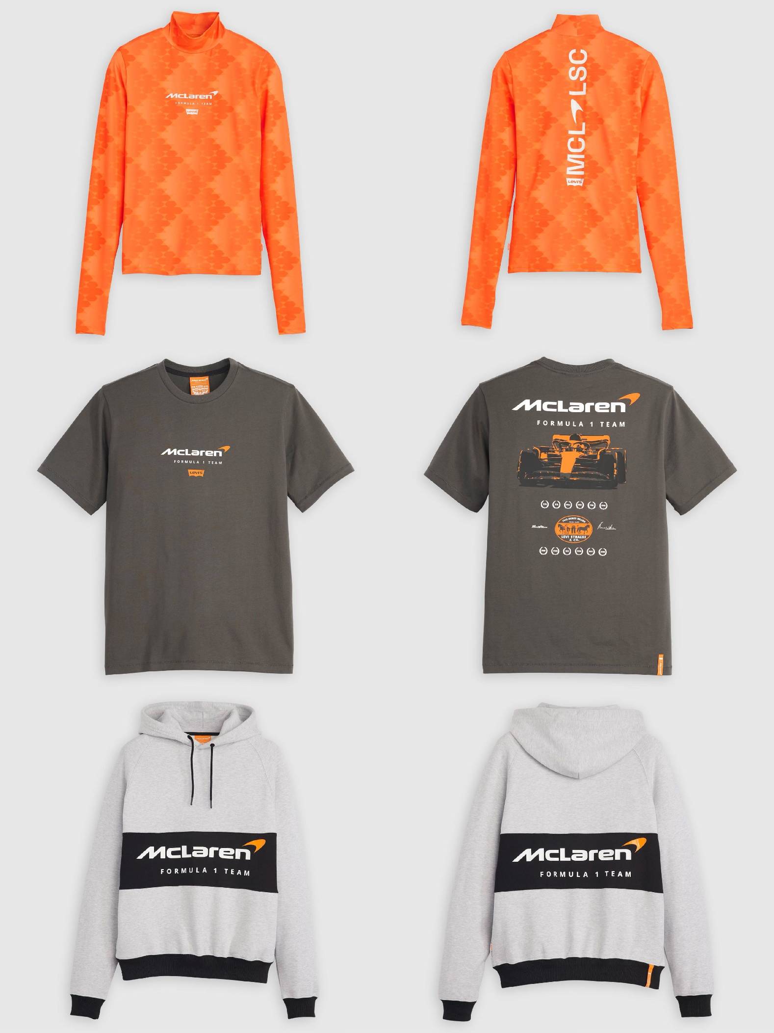 橙色长袖高领皮肤衣以迈凯轮赛车的模块化印花为灵感,具有高光泽度的观感。宽松的T恤上饰有纪念迈凯轮赛车多年来胜利的月桂花环,布鲁斯·迈凯轮(Bruce McLaren)和李维·斯特劳斯(Levi Strauss)的签名,以及双方的品牌标识。连帽衫采用灰色主体拼接