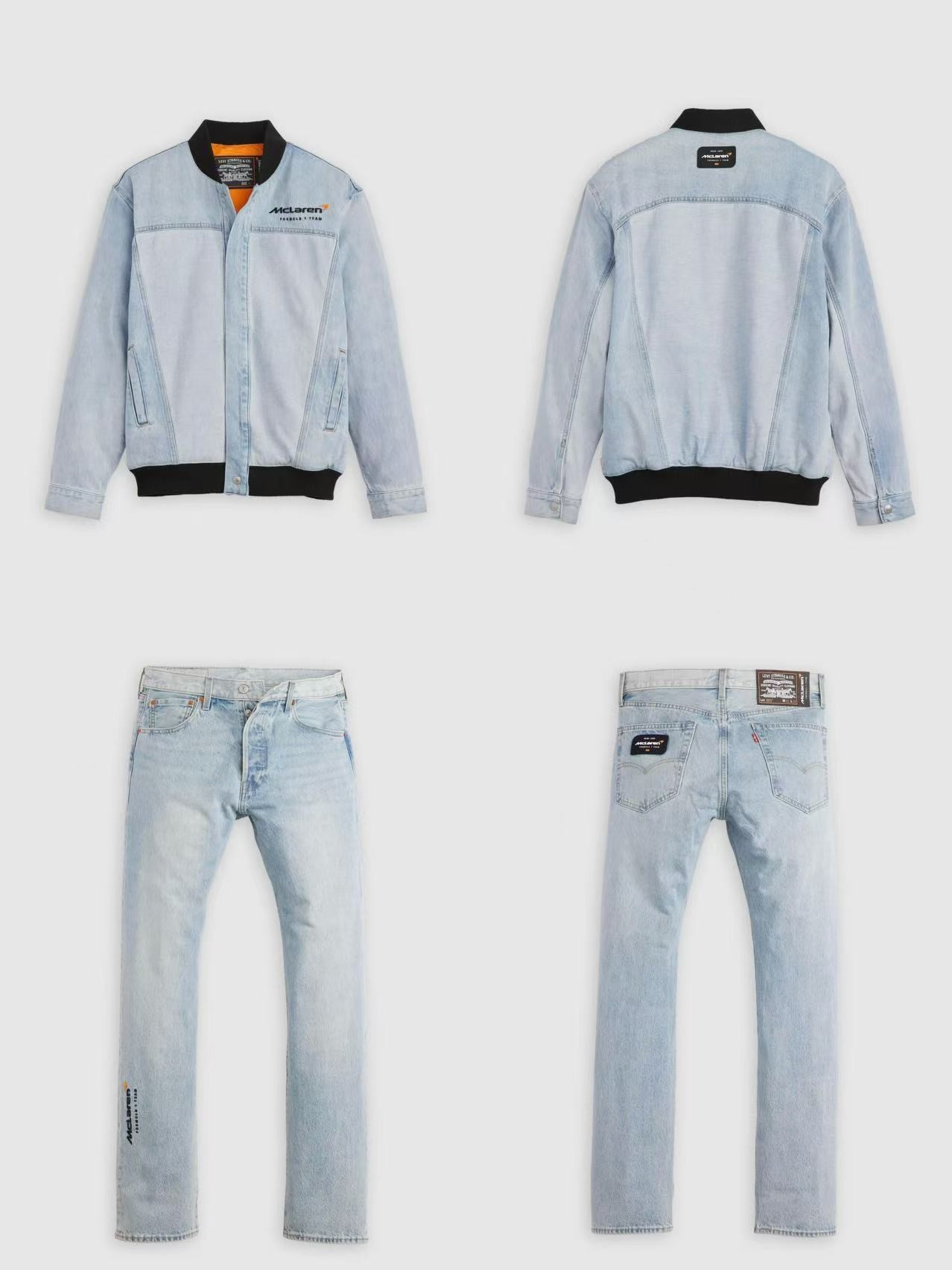赛道版夹克以丹宁飞行员夹克为原型,胸部和背部采用对比鲜明的拼接设计,领口及下摆为反差色罗纹。左前胸处有“McLaren Racing”的刺绣字样。与夹克相呼应,运动版501® 牛仔裤则在腰头部位采用了双拼色丹宁面料。牛仔裤以现代经典的501® ’93直筒版型为蓝本,左裤腿上同样绣有标识刺绣。两款产品均有黑色联名定制款双马皮牌标识,皮牌标识设计模拟了赛车底盘饰板。