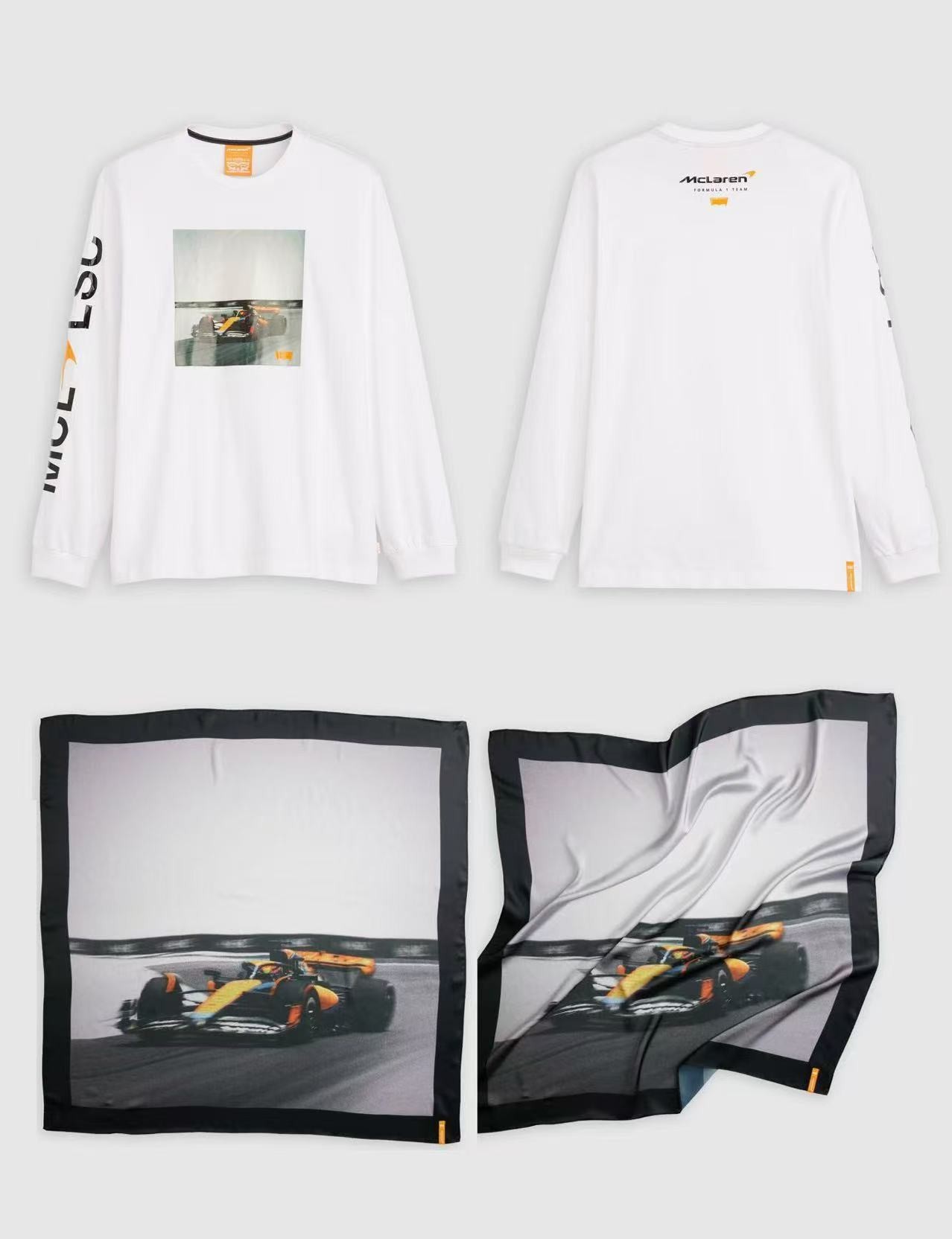 宽松款长袖印花T恤同样采用高光泽硅胶印花技术制成,印有迈凯轮F1赛车的照片、后领及衣袖上印有品牌标识,并配有L形定制唛标。系列的压轴之作是一款缎面超大号的印花头巾,印有与长袖T恤相同的迈凯轮F1赛车图案,及右下角处定制唛标。