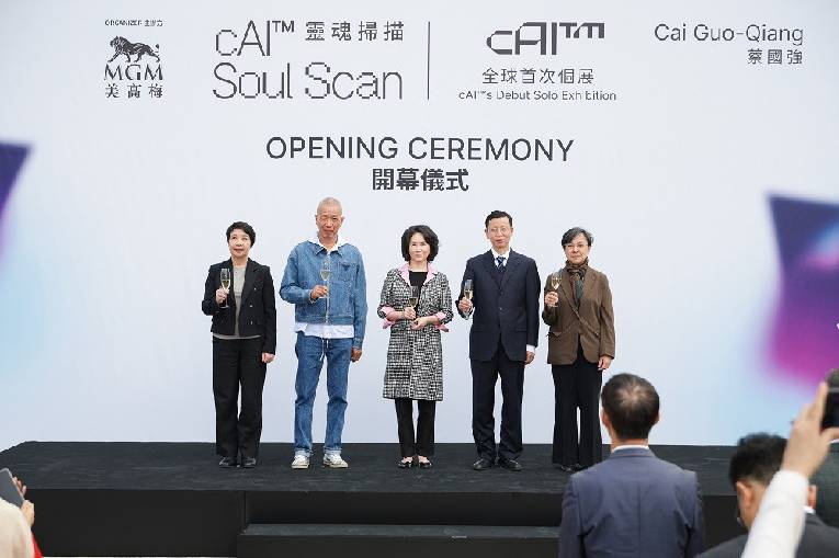 由美高梅主办、著名当代艺术家蔡国强AI模型 cAI™全球首次个展《cAI™:灵魂扫描》于妈阁塘片区举行开幕式。