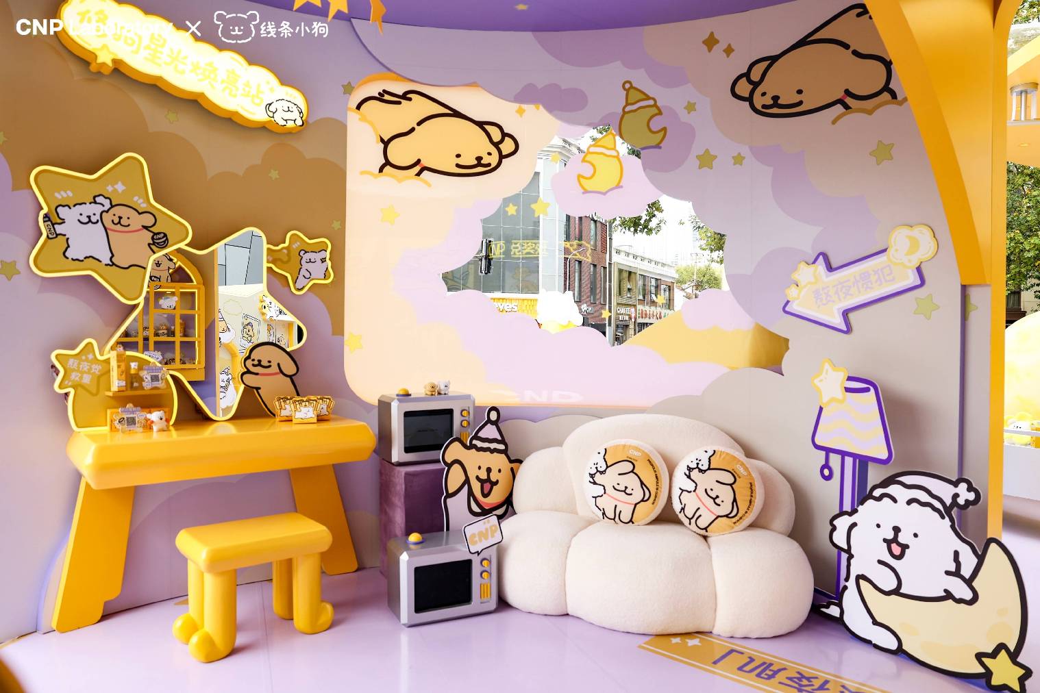 为了加深联名事件影响力,我们在上海TX淮海打造「CNP熬夜星球」快闪活动,线下装置共有八站,第一站为熬夜星球太空站,在这里你可以纵观整个星球,线条小狗已经准备好和你一起登陆咯;第二站为蜜光修狗联盟PK站,和线条小狗联盟,见证治愈超能量;第三站为熬夜能「亮」收集站,收集CNP蜂胶能量,对抗熬夜危机;第四站为熬夜修护体验站,体验不同的CNP蜂胶产品,熬夜疲态统统闪开!