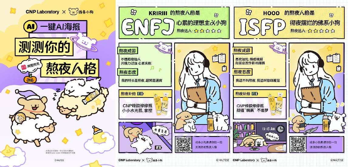 在开展线下活动的同时,为了更好的吸引年轻消费群体,在线上打造了「熬夜人格测试」,邀请年轻人一起来看看自己在线条世界里的样子。进入「熬夜人格测试」上传照片即可AI一键生成线条形象,带你走进线条小狗的世界。16型人格测试,有巨能熬的ENFP,有熬夜修仙的ISTP......充满趣味的人格分析和可爱的线条形象,增加AI海报的自主分享,形成自来水式的传播,占领朋友圈。同时,深度链接了年轻群体的喜好,进一步扩大了CNP与线条小狗的联名事件影响力,线上线下齐头并进。
