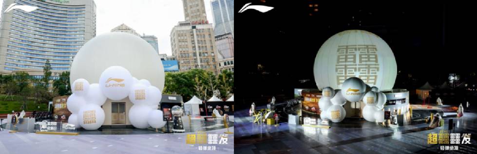 本次超䨻快闪活动集创意视觉呈现、科技分享会及沉浸式互动体验于一体,让超䨻科技的非凡性能与体验通过多元的感知形式生动传递。快闪空间以巨型“超䨻球”为创意原点,打造出极具冲击力的视觉观感,为充满都市摩登气息的上海南京东路带来李宁独有的科技元素与创意理念。