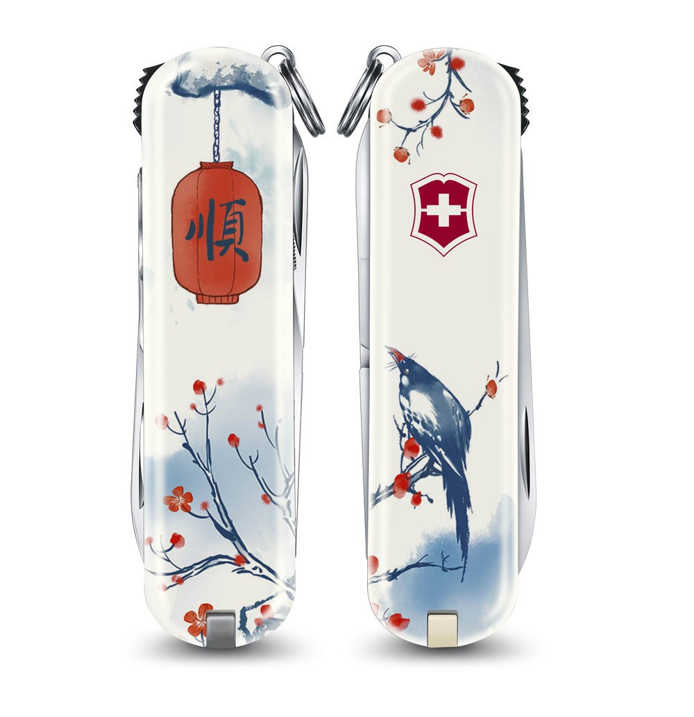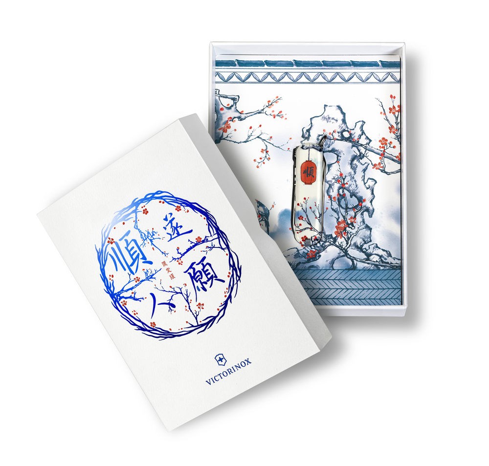 这款瑞士军刀以“旧赏园林,喜无风雨,春鸟报平安”为设计灵感。刀柄面设计采用青花瓷版画形式,以水墨勾勒出一幅满园春色的景象:正面醒目的“顺”字红灯笼悬于太湖石上,下有绽放的红梅相呼应,寓意新春红红火火,万事顺遂;背面可见喜鹊立于红梅枝头,情态可掬,寓意来年喜事到家,五福临门。数码印刷叠加保护漆面的工艺,使刀柄面还原了青花瓷器光洁明丽的釉彩质感。主刀根部运用蚀刻技术,以古朴的书法形式呈现“顺”字,巧妙呼应刀柄面正面的“顺”字,展现出中国传统书法的筋骨之美。