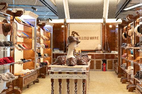 在中古世纪与现代时空交错穿梭的HALLOWHARE空间中,复古设计为限时店注入古典神秘的气息。以木质搭建为视觉基调,搭配独具现代未来感的玻璃及不锈钢元素,各式各样的帽子陈列在精致的木质层架上,尘封的古俄罗斯小店被一股现代先锋力量唤醒,矛盾地交织着浪漫与荒诞。访客仿佛跌入穿梭在过去与未来的时空缝隙,感受艺术与时尚的奇妙碰撞。