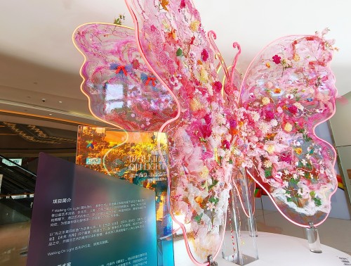 广州站展出的是由先锋艺术家刘沛翎打造的《流光·蝶变》,色彩斑斓的蝴蝶形象,在光线映照下栩栩如生。光线反射在蝶翼上,与飘逸的绸带一起轻盈律动,呈现出流光幻彩之美。值得一提的是,结合广州作为海上丝绸之路起点这一历史背景,艺术家在广州站的创作中巧妙运用丝绸元素,尽显丝绸细腻柔和之美的同时,又融入广州独特地域特色,艺术的流动与城市发展脉搏在此交融。与《流光·蝶变》同期在星寰展出的还有数字艺术家刘富生的作品《幻彩》,利用星寰场内世界罕见的135米丝带LED屏幕,融合现代科技与传统艺术,以光线作为画笔,传统山水与幻影交织,创造出一个超现实的东方美学世界。