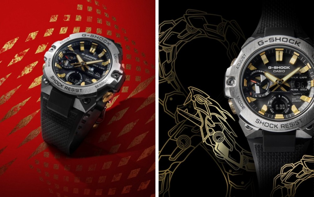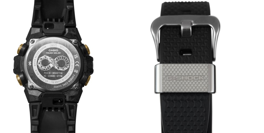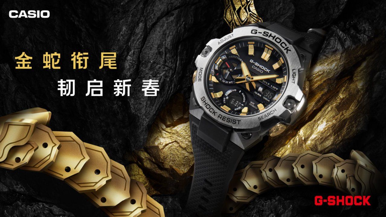 锁定金蛇坚韧灵动的力量,全新腕表以畅销型号GST-B400为基础,采用黑色、金属银与金色三色勾勒蛇年气势。指针、刻度与按钮部分都以金色刻画,而且按钮、游环还呈现出蛇皮纹理,演绎金蛇非凡奢感。