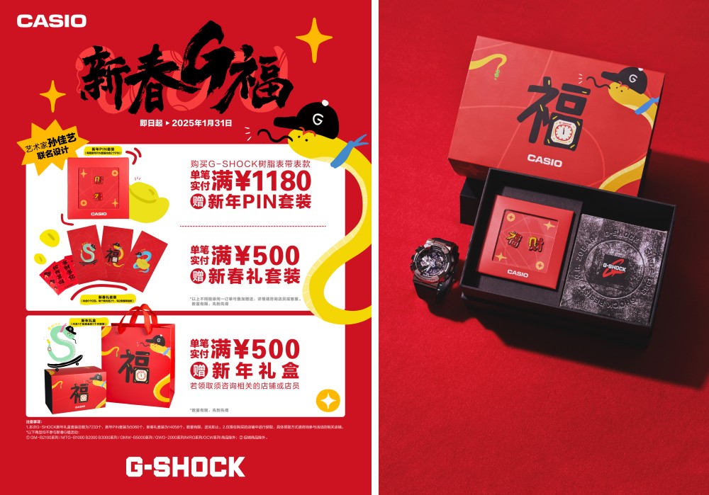 此外,G-SHOCK还携手视觉艺术家、TEAM G-SHOCK孙佳艺打造新春G福礼盒。自12月26日起,凡购买G-SHOCK手表实付满1180元,即可获赠G-SHOCK与孙佳艺联名打造的新春G福礼盒。在此,G-SHOCK也为大家带来了潮流送礼清单。