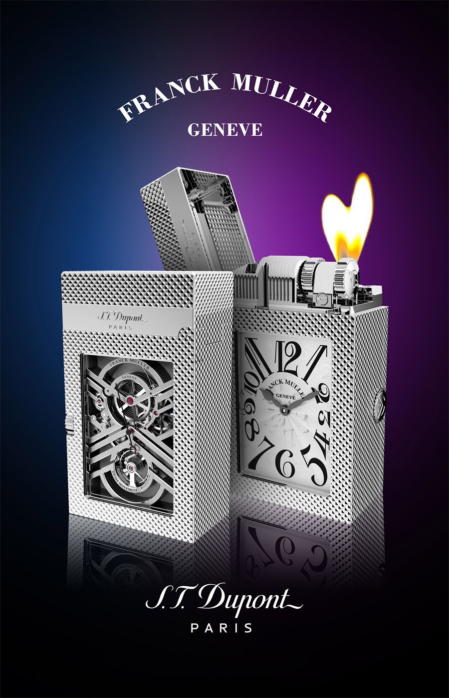 法国都彭联袂瑞士先锋制表大师品牌法穆兰(Franck Muller),历时两年,共同缔造全球首个镂空计时打火机系列——法穆兰联名系列大师打火机。该系列完美结合了高级钟表工艺和金匠艺术,成就了火艺大师与制表大师的跨界合作,是两个同样拥有出色技艺的行业巨头在奢华配饰和高端制表领域的罕见突破,大师打火机成为双方创意交流的璀璨结晶。