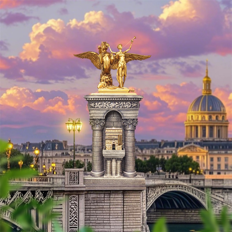 亚历山大三世桥珍藏版朗声打火机套装以美轮美奂的布扎建筑亚历山大三世桥为设计灵感,全球限量88套。这座著名桥梁横跨巴黎塞纳河两岸,将香榭丽舍街区与荣军院及埃菲尔街区连为一体,同样串联起了法国都彭历年来的经典之作。镀金与冷锻黄铜交织成火机底座,顶部以立体雕刻还原亚历山大三世桥桥塔上的金色骏马雕塑,象征科学、艺术、工业与商业的金色飞马身披鎏金,雄姿昂扬,蹄踏于桥塔之上。以经典朗声打火机为基底,配合标志性“Cling”之声,开合间打响新艺术运动的余韵,将来自1900年的鎏金岁月铸成可携带的时光琥珀。