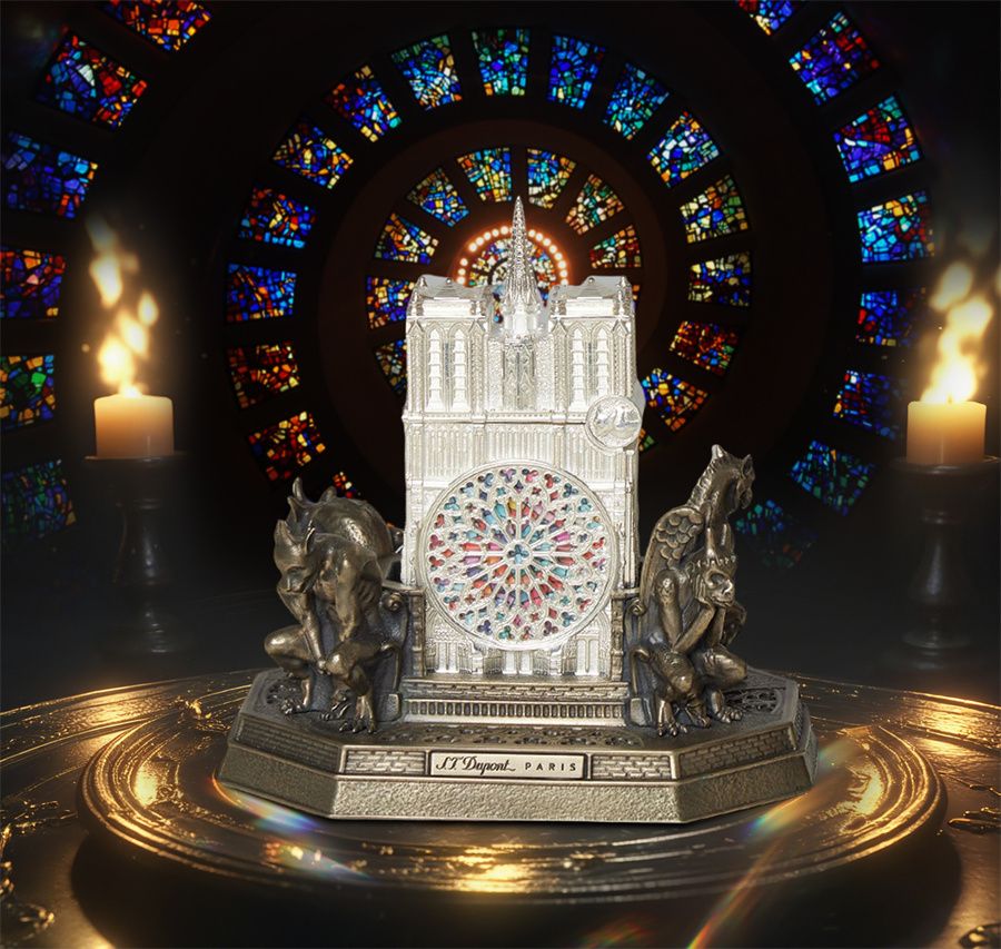 为庆贺巴黎圣母院浴火重生、重新开放,法国都彭将巴黎圣母院的壮丽与神圣凝聚于方寸之间,以全新典藏套装重铸文明丰碑,让每一位收藏者都能感受到那份穿越时空的震撼与感动,全球限量88套。以法国都彭格兰德火机为基底,并将巴黎圣母院哥特式建筑特点细腻刻画于火机之上,机身中心幻彩漆面巧妙还原梦幻绚丽的珐琅玫瑰窗,每一块色彩都承载着源于13世纪的圣光色谱,透过细腻的铅条接缝,展现飞扶壁般的精妙肌理。打火机底座上立体雕绘的四尊滴水兽盘踞于四角,利爪紧扣珐琅火焰纹铜柱,表面那层层叠加的做旧氧化层,仿佛与历史同频共振,成就860余年风雨沧桑化于掌间的建筑史诗。