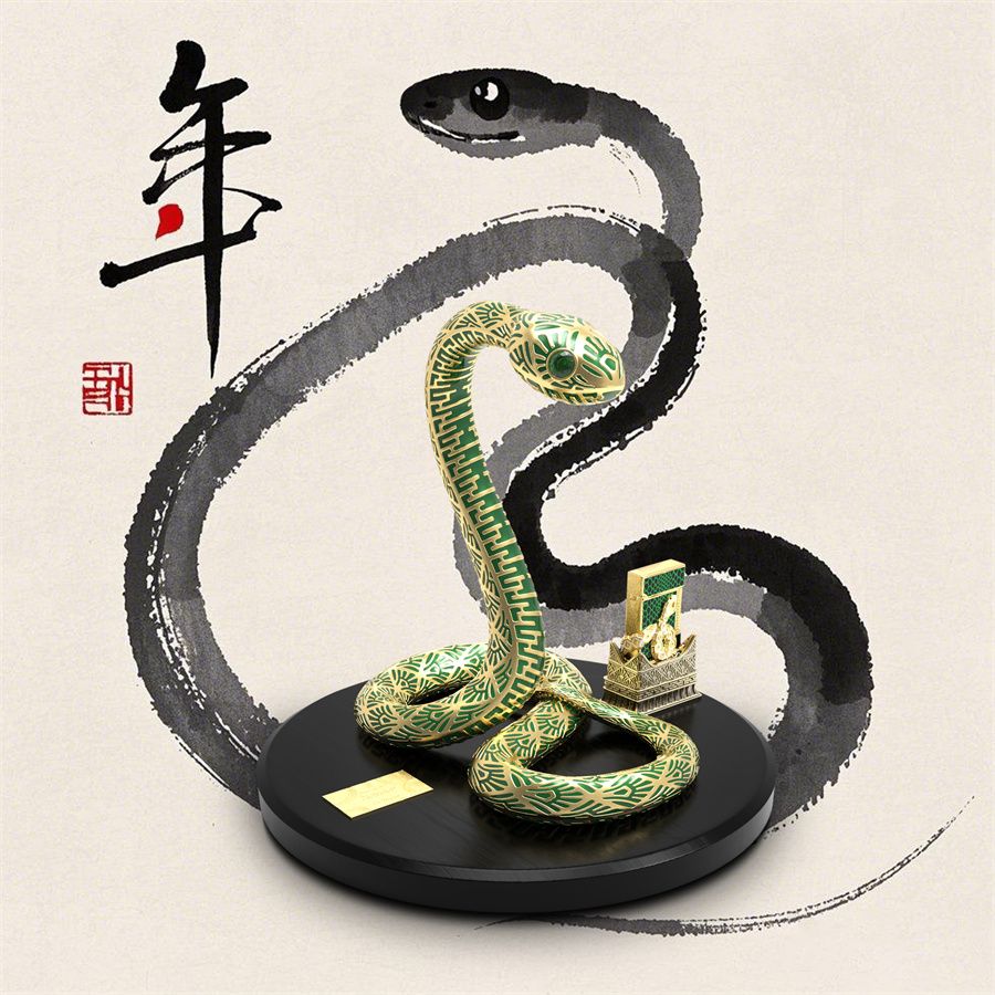火机以经典格兰德系列机型作为基底,于方寸机身上手工立体雕刻呈现灵动蛇形,镀金饰面蛇身以白色天然漆勾勒细腻蛇鳞纹,双点火系统藏于蛇首七寸,炽焰似金蛇吐信,再覆以常用于腕表的 Luminova 夜光涂层,在黑暗中也能绽放灵动光彩。青铜基座覆手工凿刻灵蛇之身,神秘且富有张力,镀金线条游走于翠绿天然漆面之上,呈现生动气韵,勾勒蜿蜒盘坐而上的灵动蛇形,盘踞命运经纬,尽显浓郁东方魅力。
