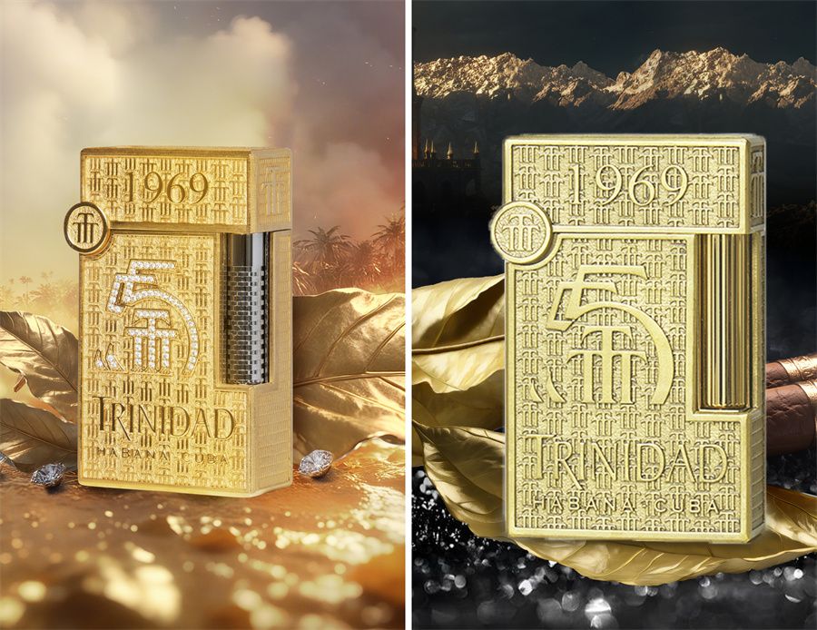 烟具套装包含主题格兰德打火机及雪茄剪,全球限量55套。火机正面镶有69颗钻石构成的数字“55”,铭刻特立尼达自1969年诞生以来的制茄传承,映耀半世纪的卓越风华。背面精妙刻绘特立尼达标志性塔楼,于细节间交融历史韵致与现代优雅,尽显尊贵仪式感,映耀雪茄世界的恒久魅力。主题款朗声打火机全球限量88件,以鎏金铸刻工艺淬炼,并立体雕刻有特立尼达“3T”品牌标识及“1969”品牌创立年份,展现其深厚专业的制茄历史。顶部则镌刻有法国都彭“S.T. Dupont”的品牌标识,在流光中满溢品牌的深厚历史及显赫光芒,是对传奇和品质的致敬。